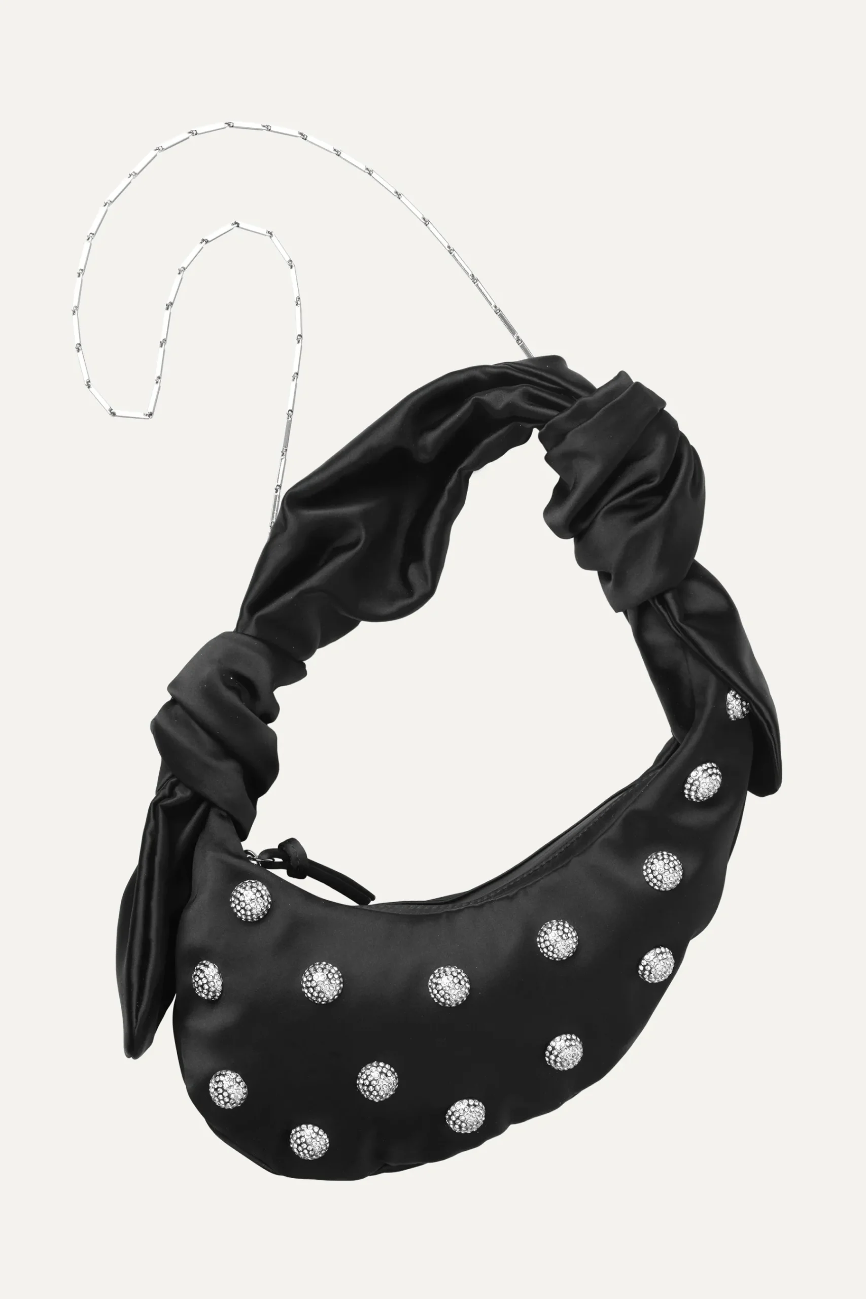 Lille hobo-taske i sort satinmateriale med runde krystal-nitter, knudedetaljer ved skulderremmen og lynlås. Detaljeret med en metalkæderem, så den kan bæres som crossbody-taske.