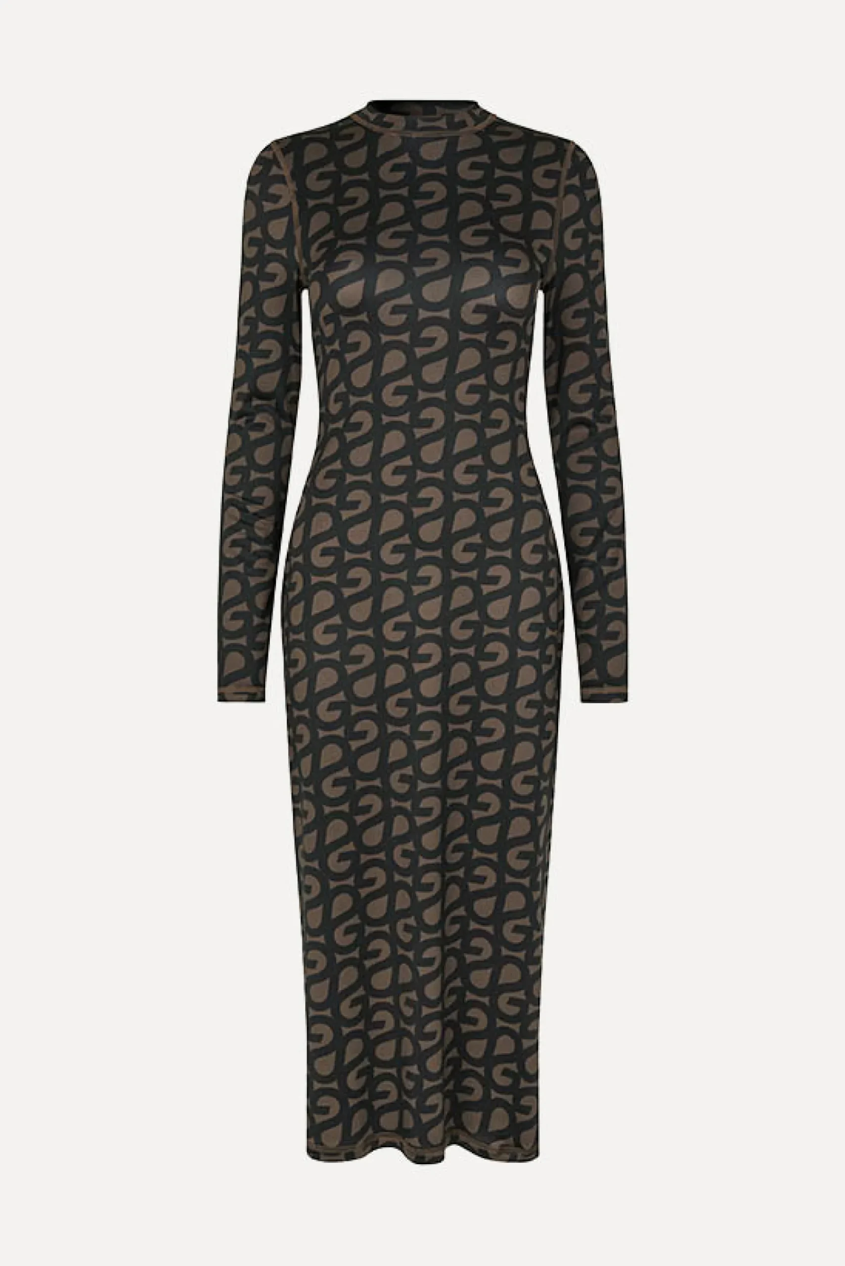 Kropsnær midi-kjole i jersey med SG-logo mønster, lange ærmer og rund halsudskæring. Den er fremstillet af blødt og strækbart materiale.
