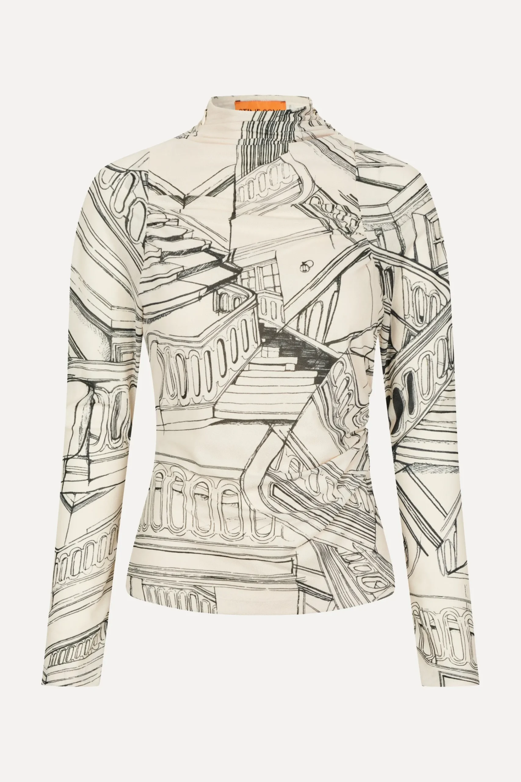 Figursyet bluse med høj krave, lange smalle ærmer og subtile rynke detaljer på kraven, i siden og ved håndleddene.