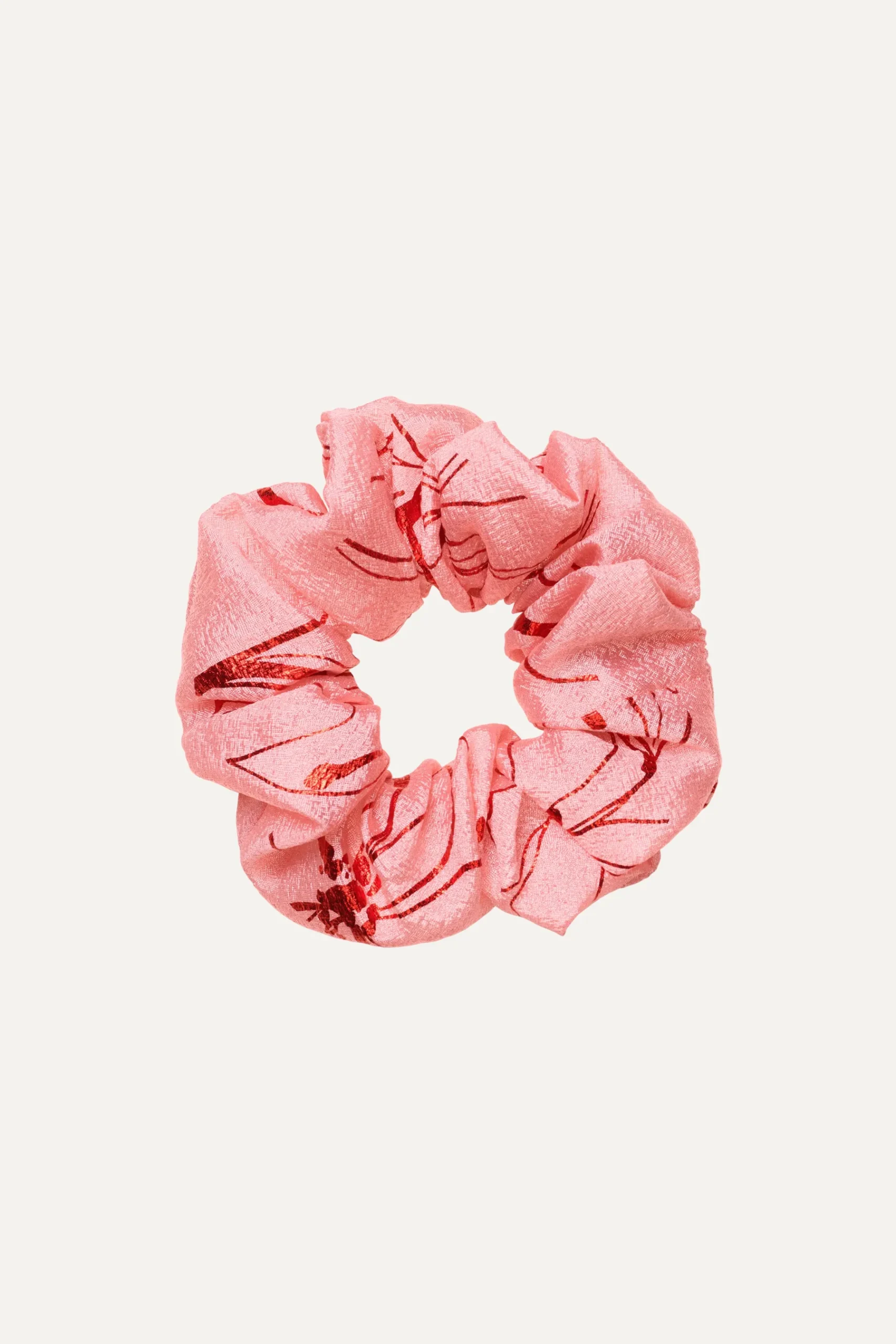 En oversized lyserød scrunchie fremstillet af genanvendt polyester, dekoreret med et rødt blomsterprint i folie.