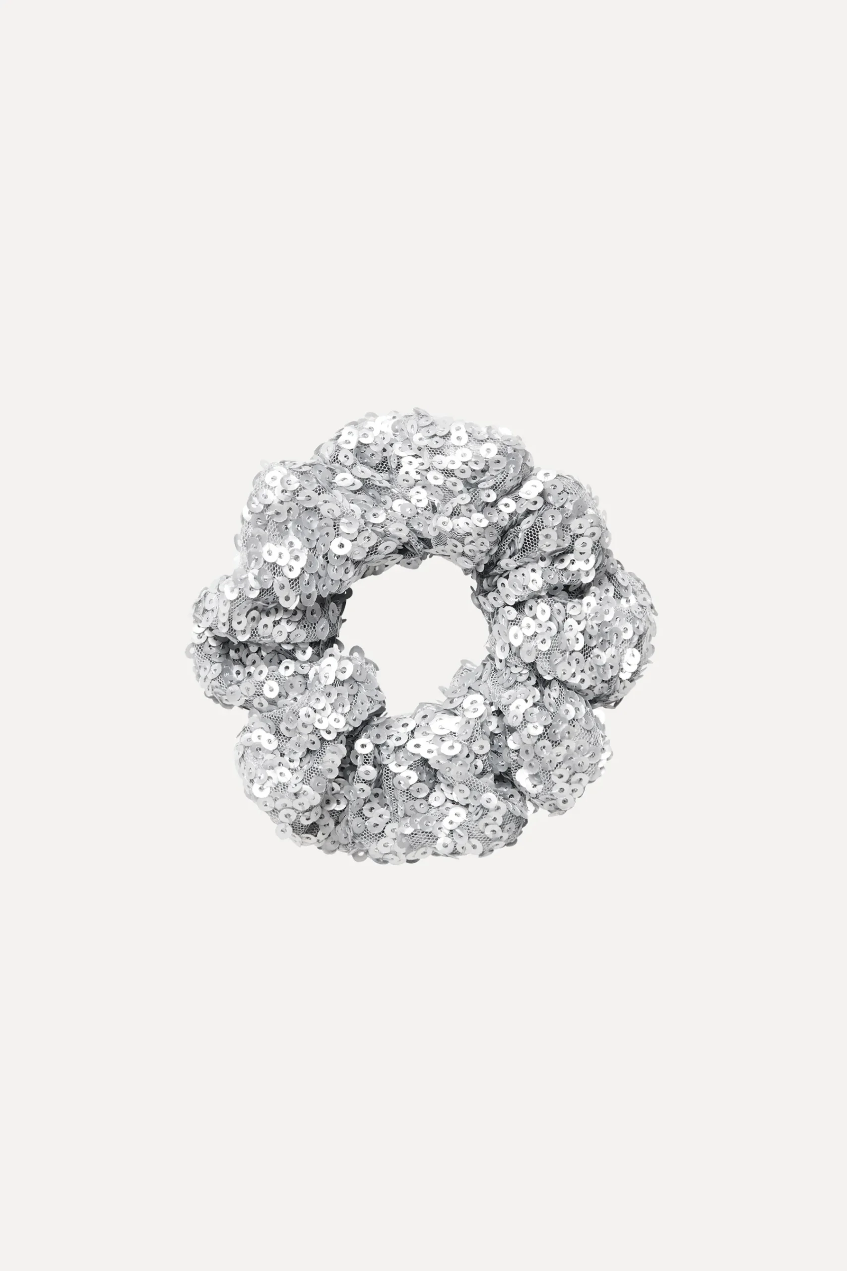 Voluminøs scrunchie med lyseblå og hvide tern. Fremstillet af genanvendt polyester.