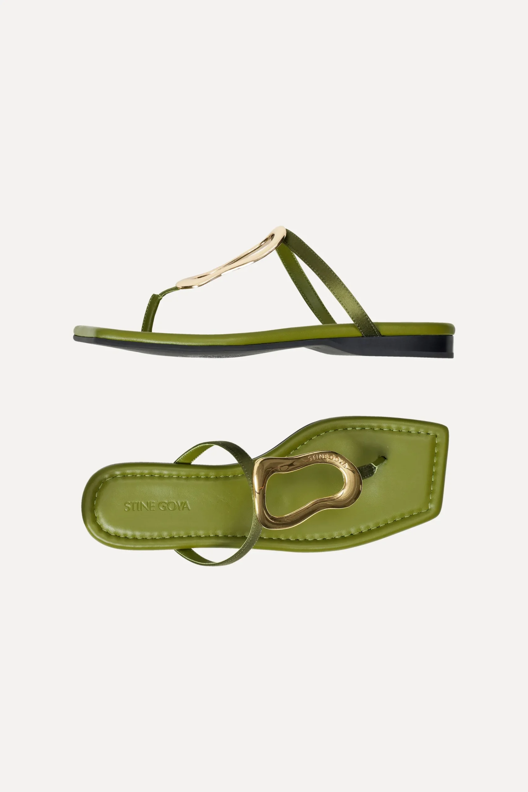 Grønne slip on-sandaler med firkantet snude, behagelig lædersål og silkeagtige remme med guldudsmykning.