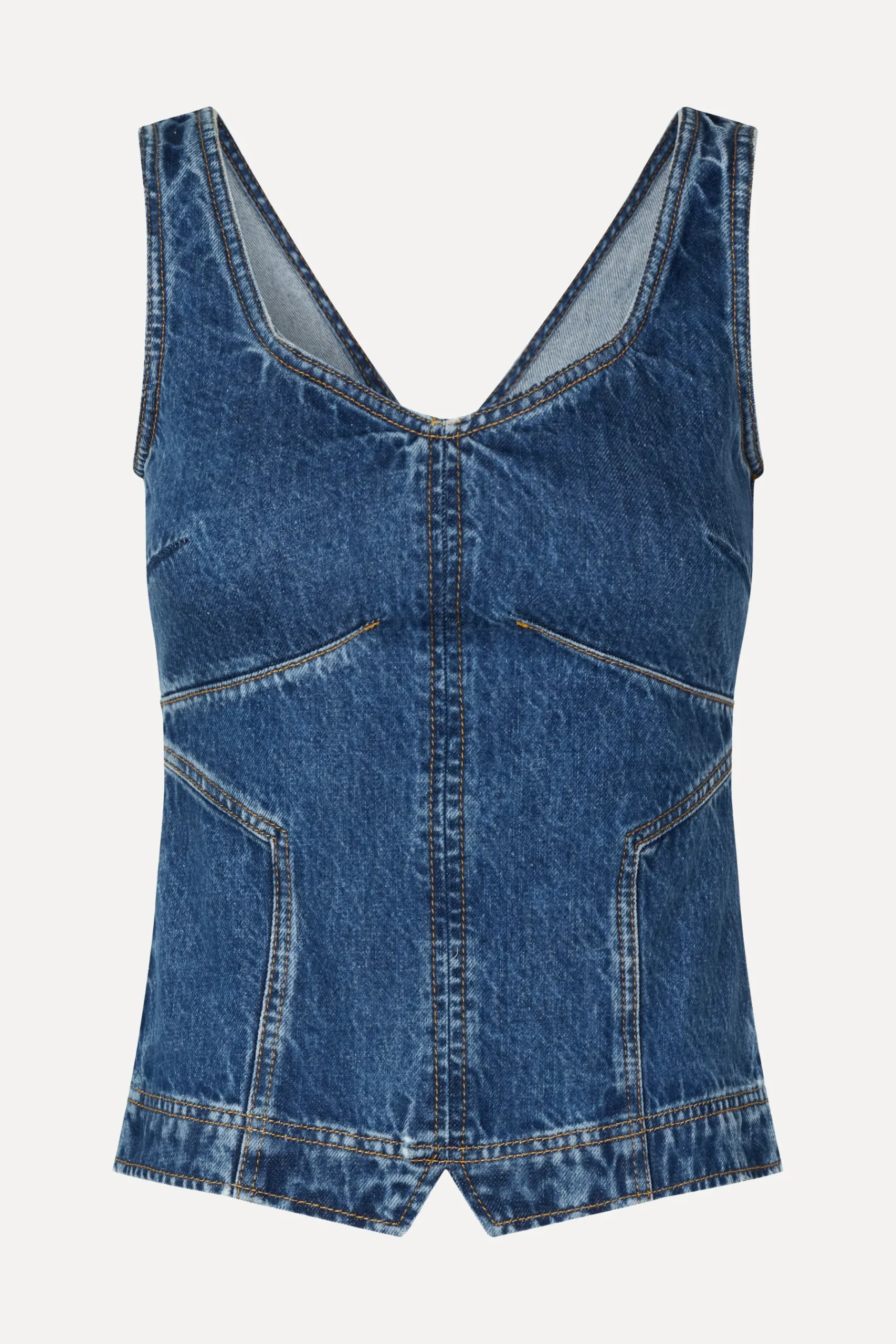 Ærmeløs blå denim top med sweetheart halsudskæring og sidepaneler. Detaljeret med dekorative syninger og lynlåslukning bagpå.