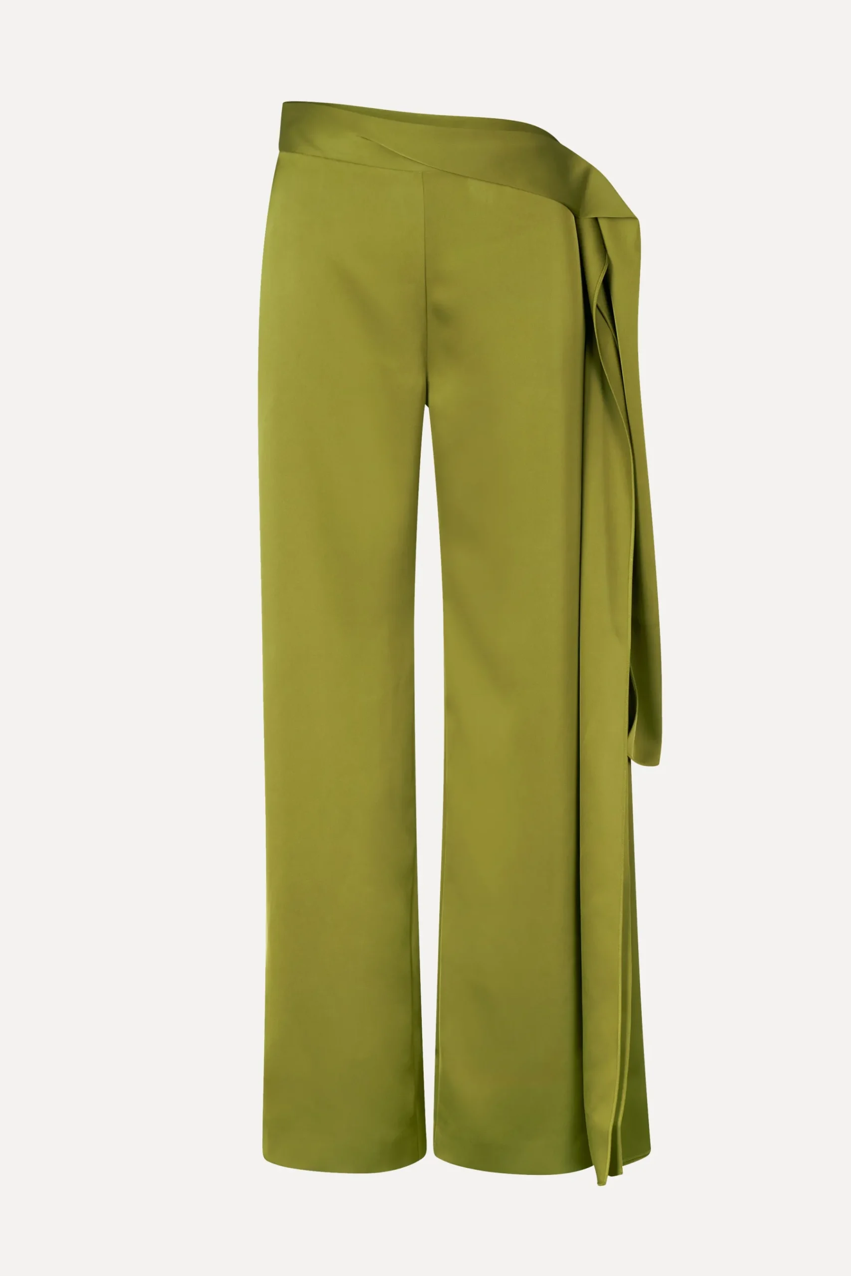 Grønne satinbukser med brede ben og en afslappet silhuet, draperet bæltedetalje langs siden og behagelig høj talje.