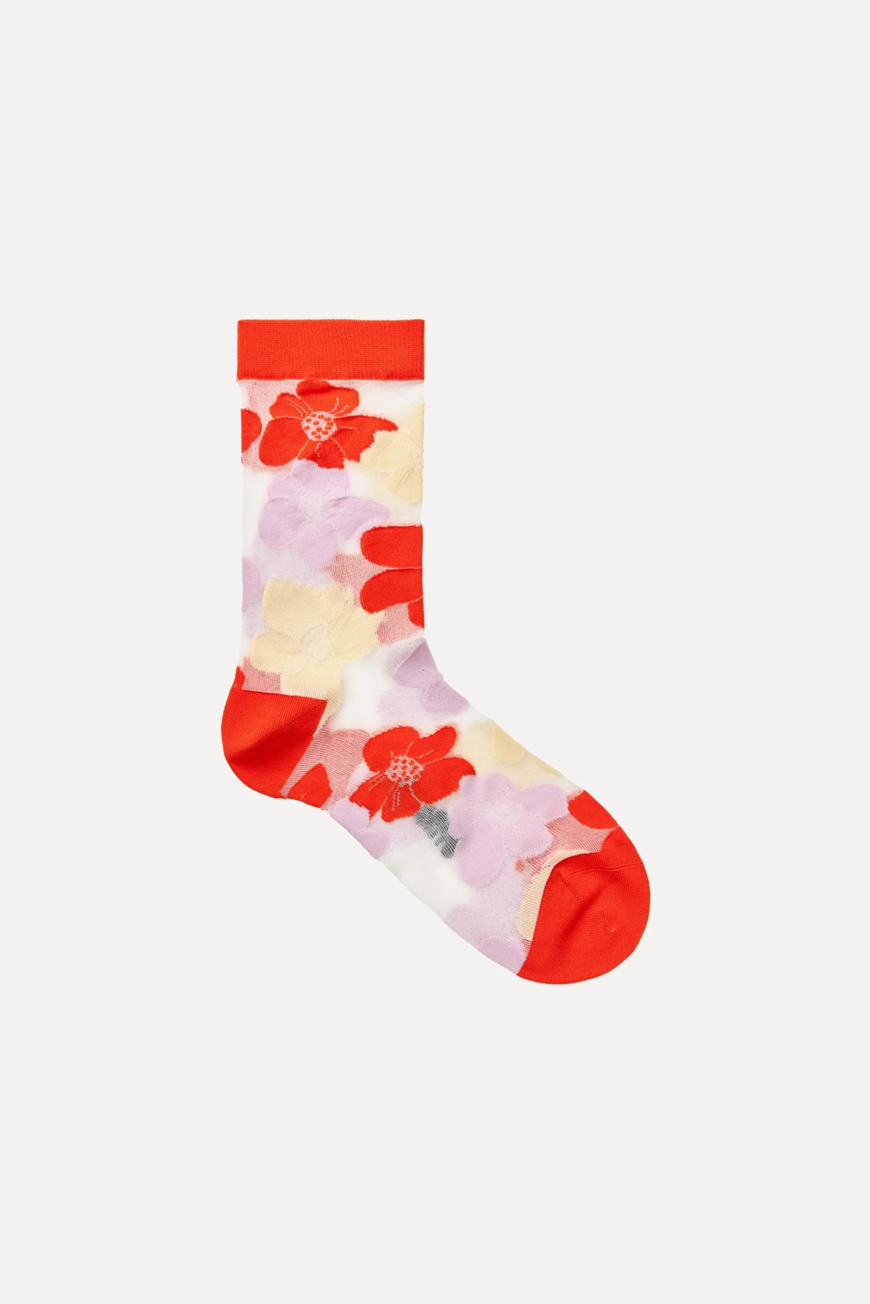 Komfortable gennemsigtige strømper med et farverigt blomsterprint. Detaljeret med forstærket hæl og tå.