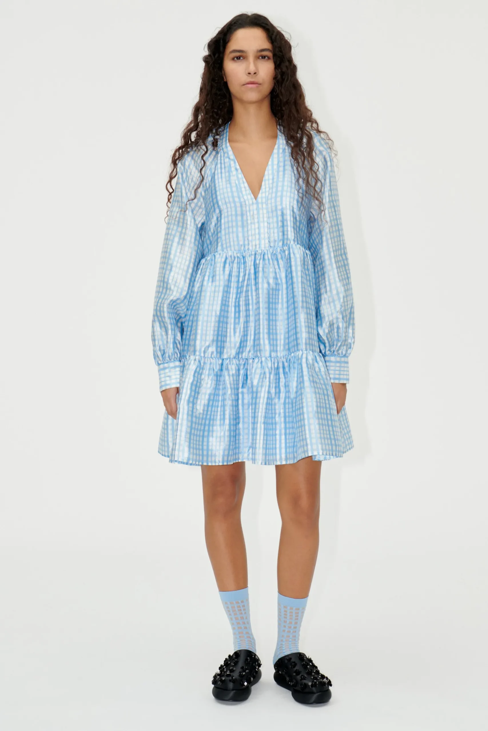 Afslappet mini-kjole med lyseblå og hvide tern. Med høj krave, V-udskæring og lange pufærmer med manchetter. Detaljeret med sidelommer. Foret.
