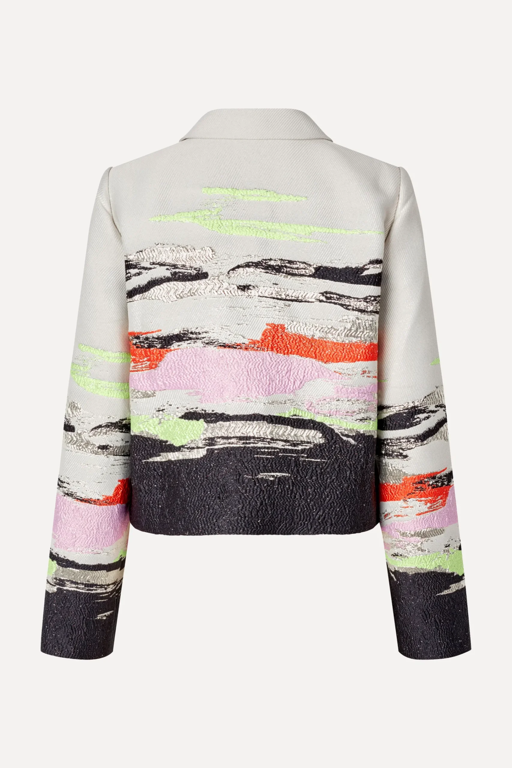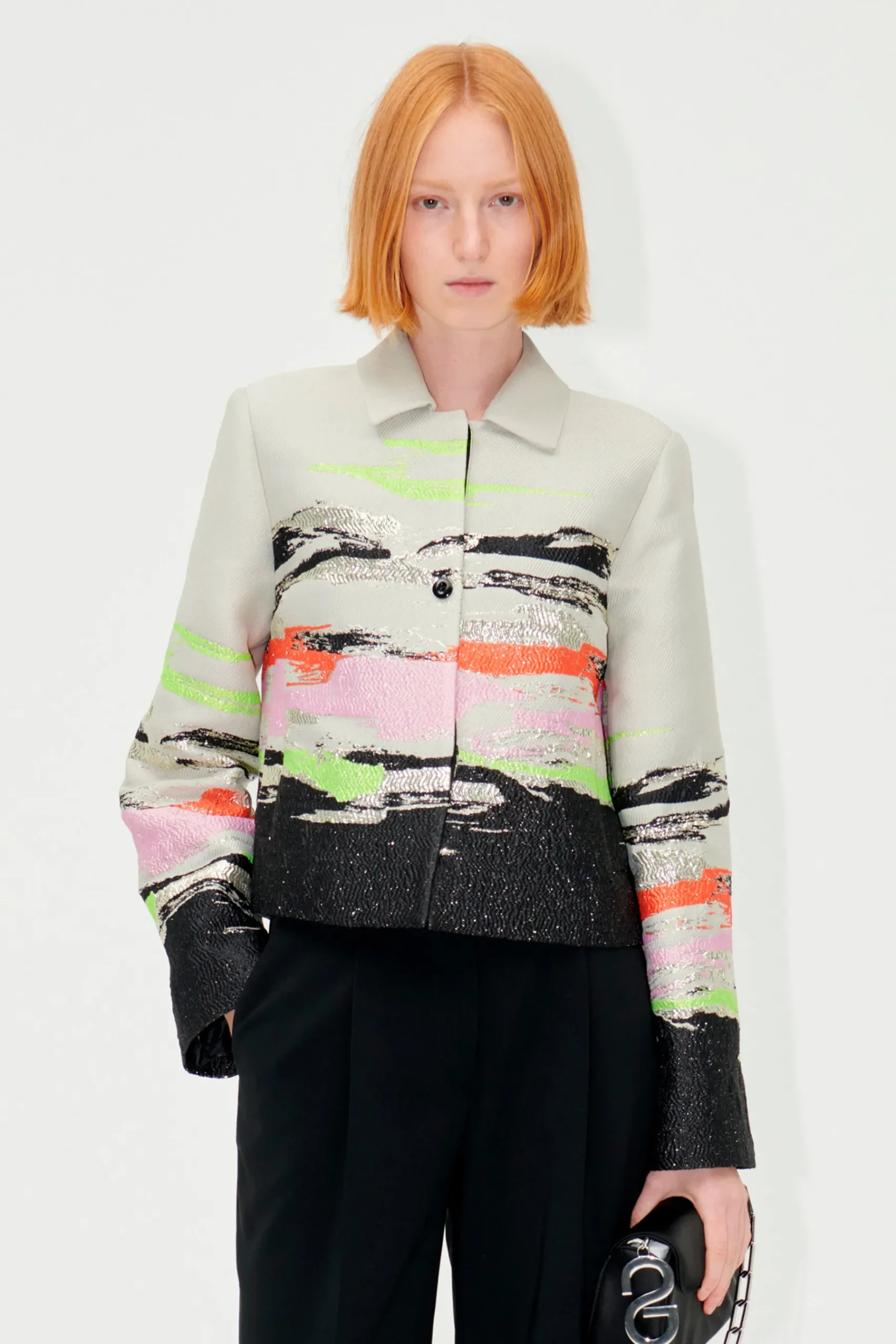 Kort jakke i en kraftig jacquard vævet kvalitet med striber og metalliske detaljer. Detaljeret med krave, lange ærmer og knaplukning foran. Helforet med STINE GOYA logo foer.