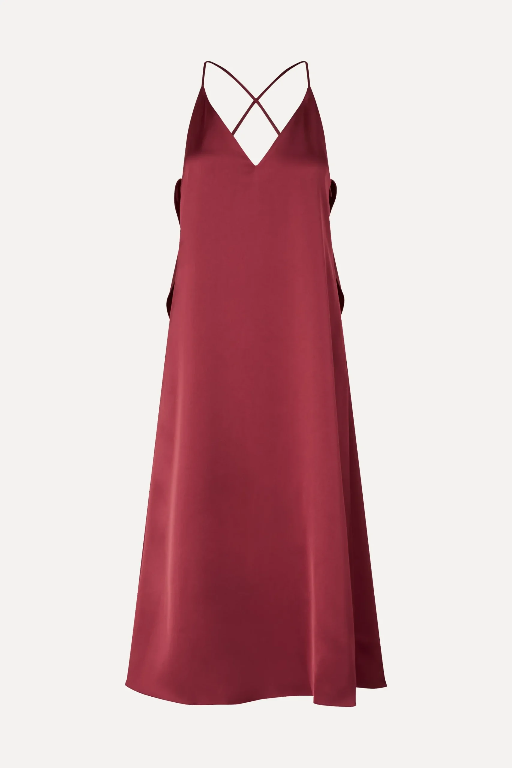 Elegant satin midi-kjole i A-linje snit med tynde krydsende stropper og subtile draperingsdetaljer på ryggen.