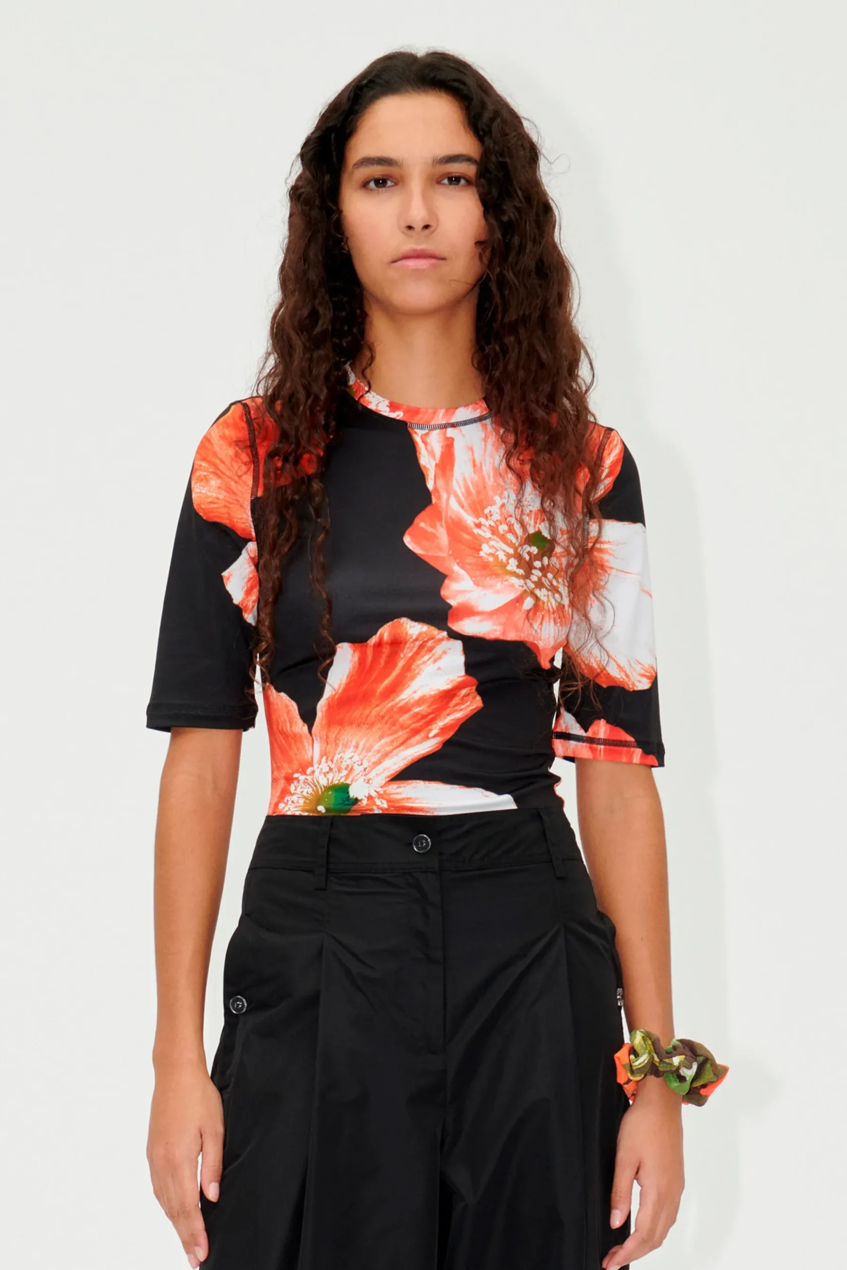 Kortærmet sort t-shirt med rødt blomsterprint, og rund hals. Fremstillet af stretchy jersey for en tætsiddende pasform.