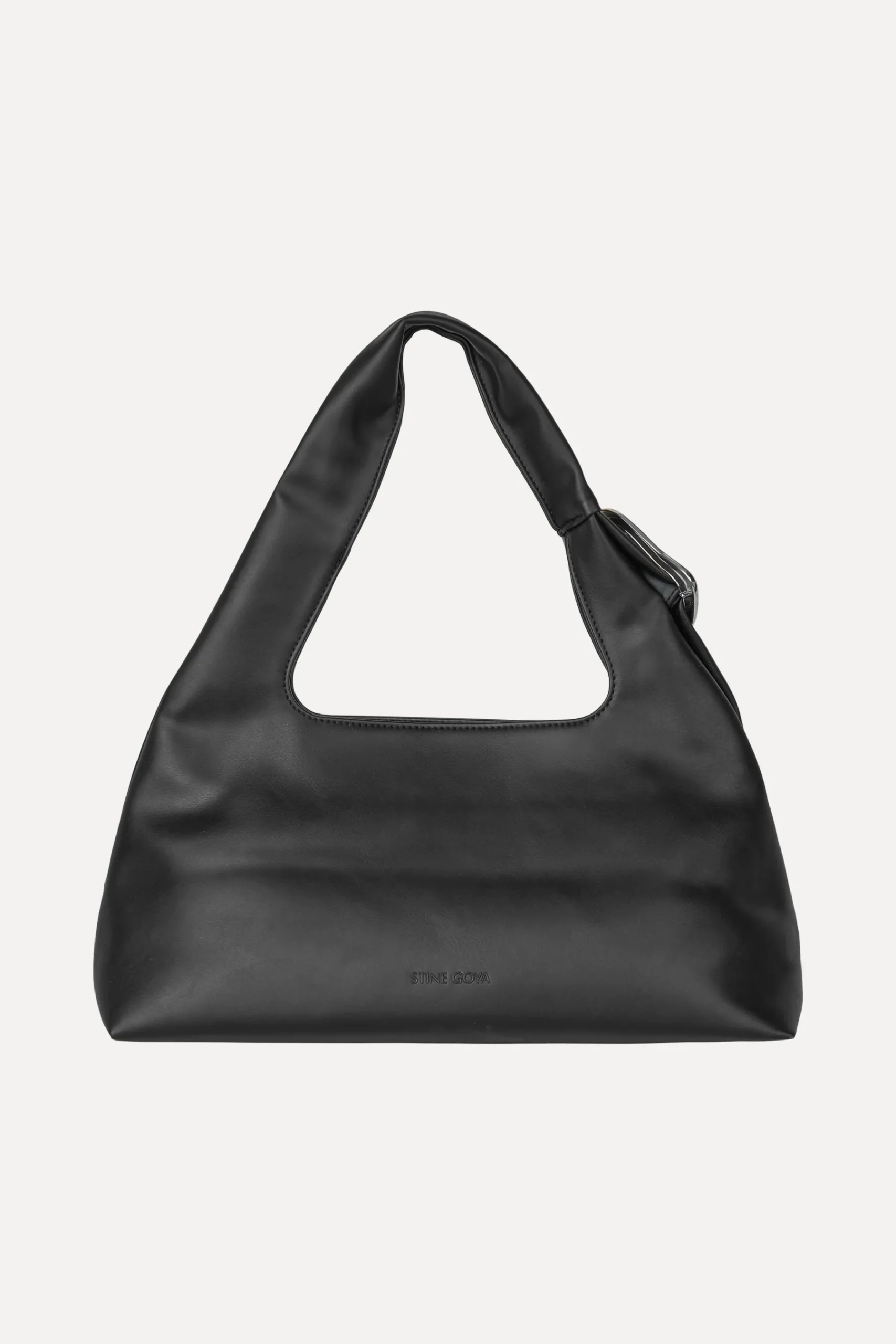 Struktureret hobo-taske, fremstillet af et sort, blødt æblelæder, med lynlåslukning og kort skulderrem med guldspænde.