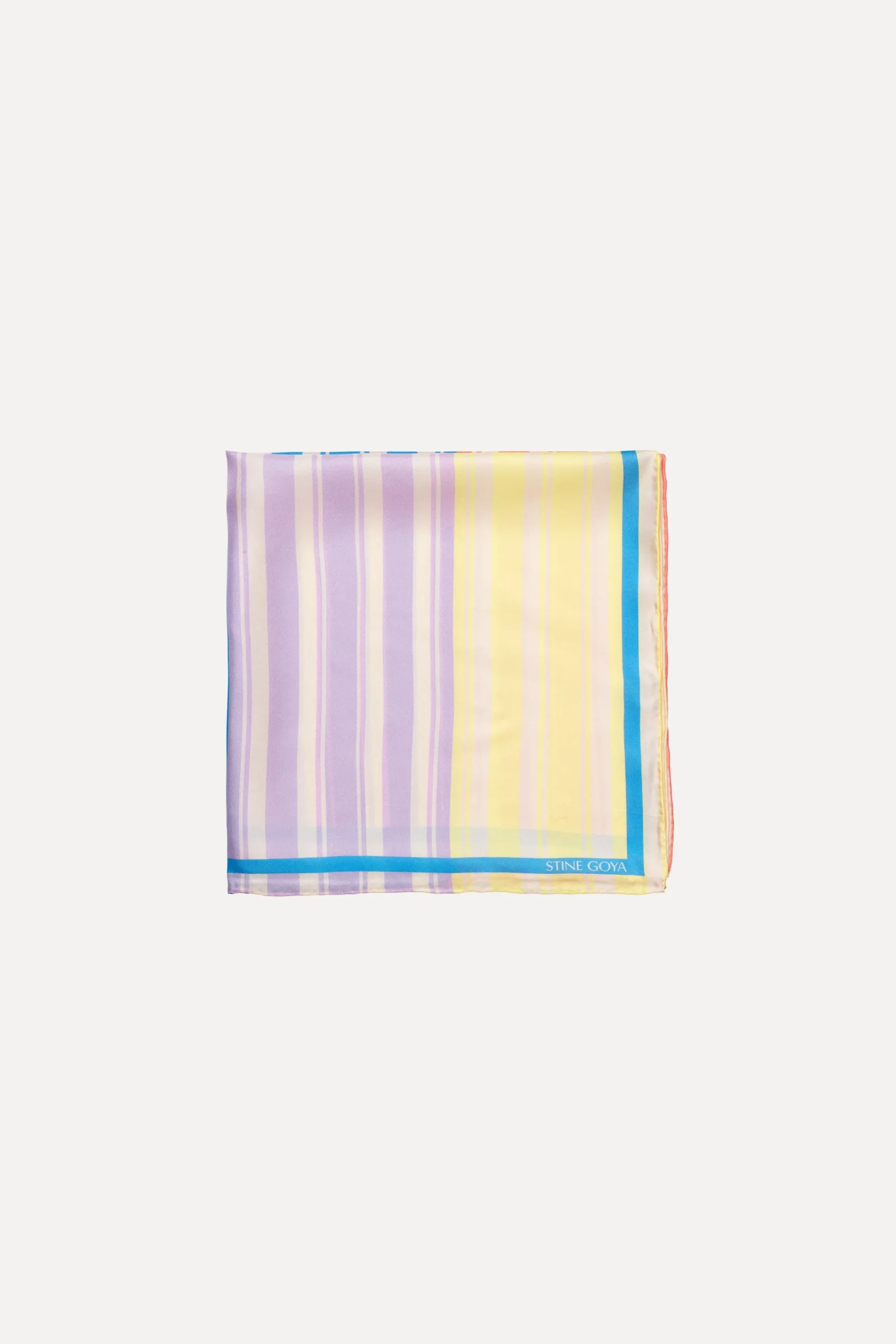 Firkantet tørklæde, fremstillet af silke twill, med et stribet, farverigt print samt STINE GOYA logo.