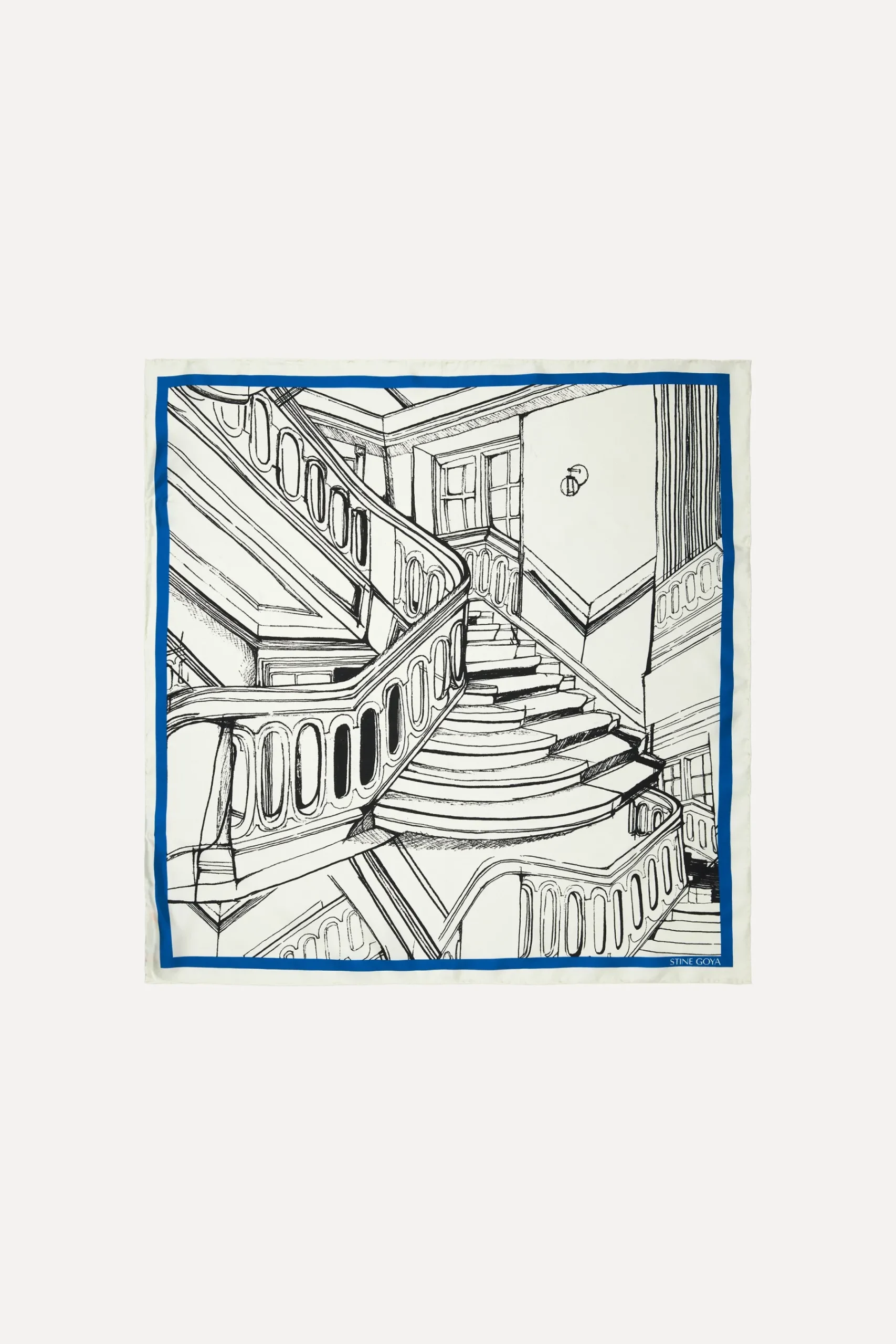 Firkantet tørklæde, fremstillet af silke twill, med et håndmalet print samt STINE GOYA logo.