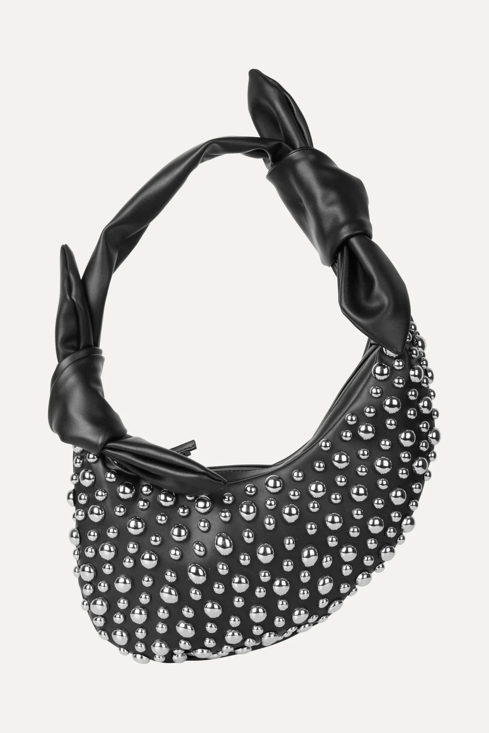 Lille hobo taske i sort æblelæder med runde metalnitter, knudedetaljer ved skulderrem og lynlåslukning. Detaljeret med STINE GOYA logo.