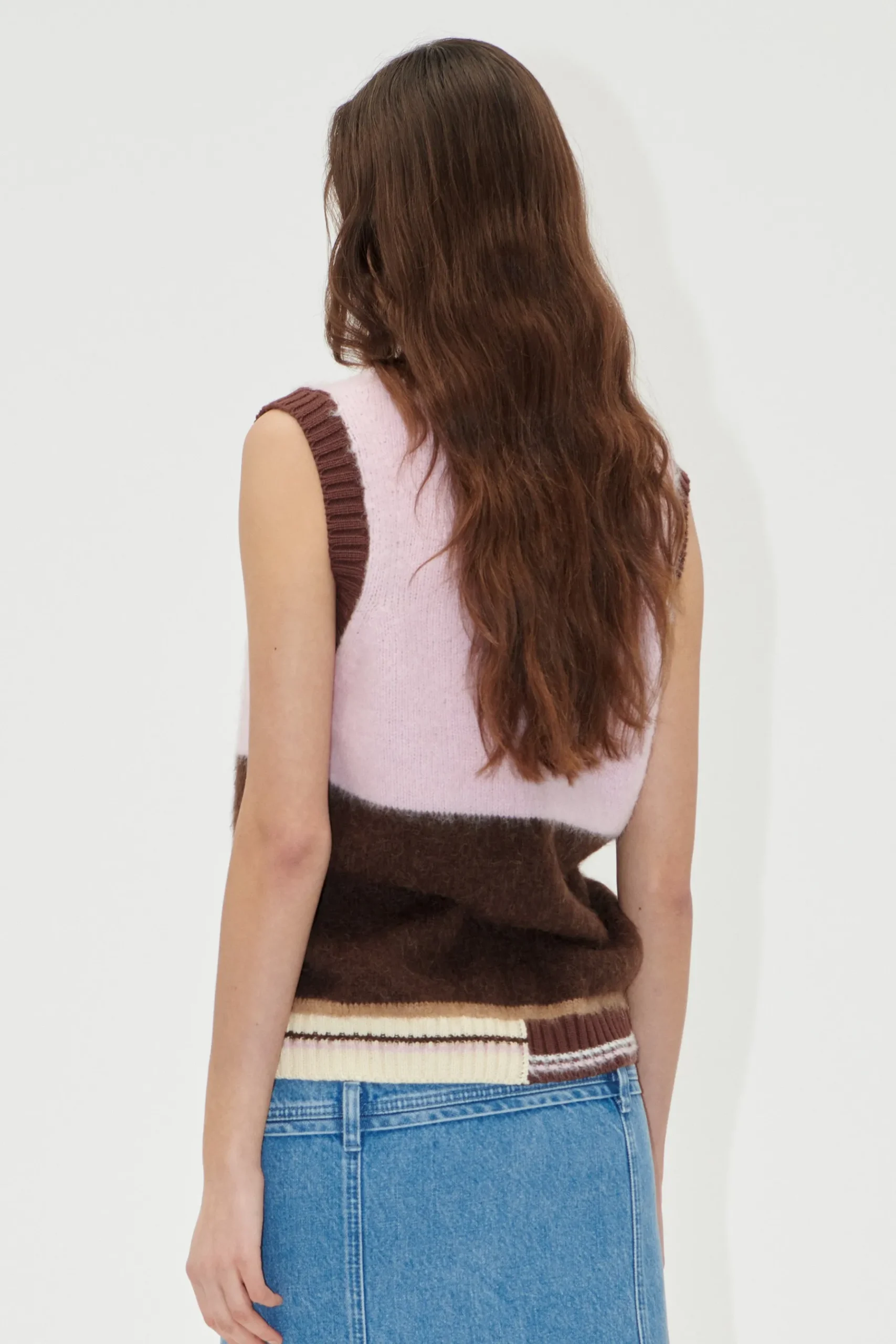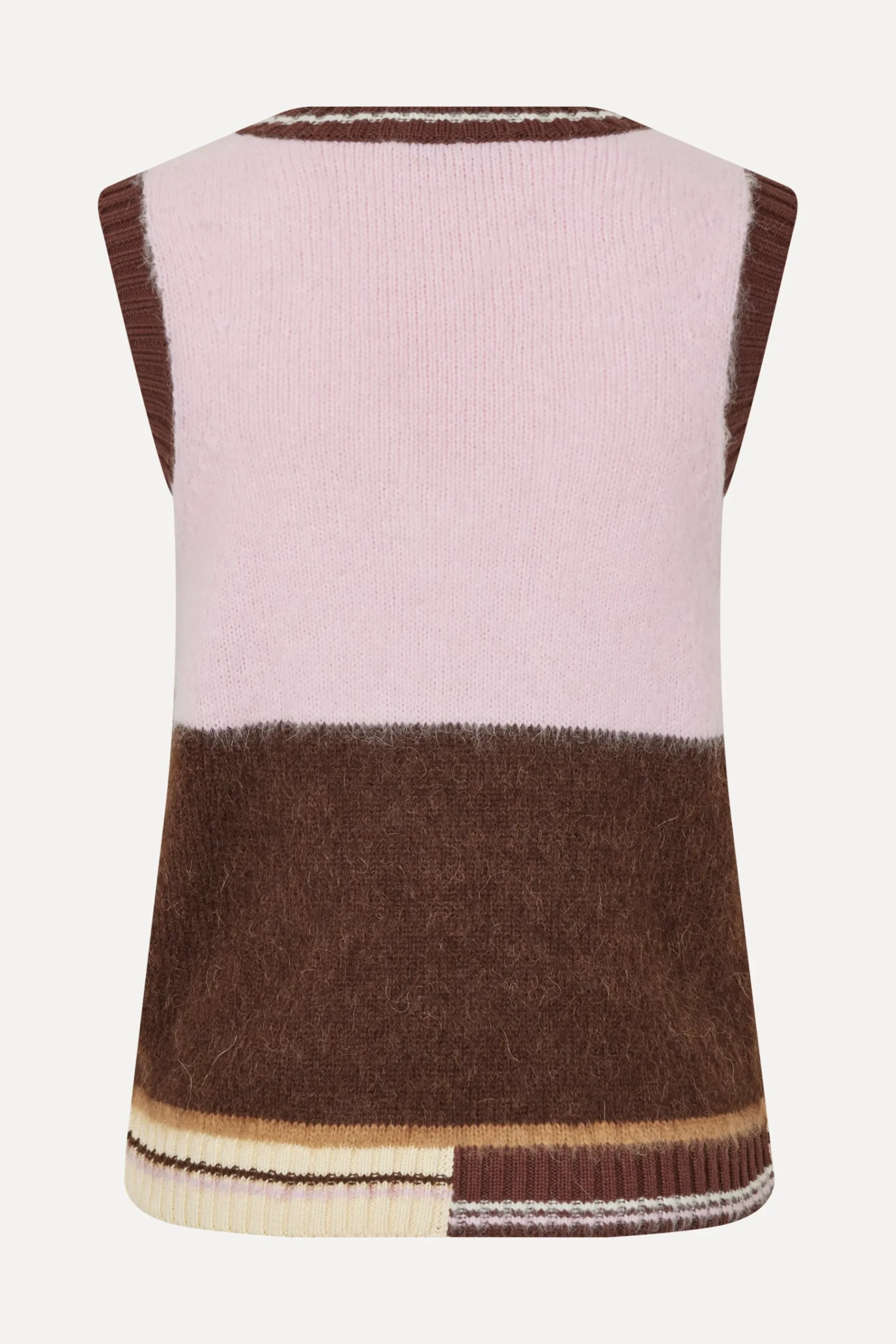 Ærmeløs strikvest i afslappet pasform med grafiske striber, V-udskæring og ribkant.