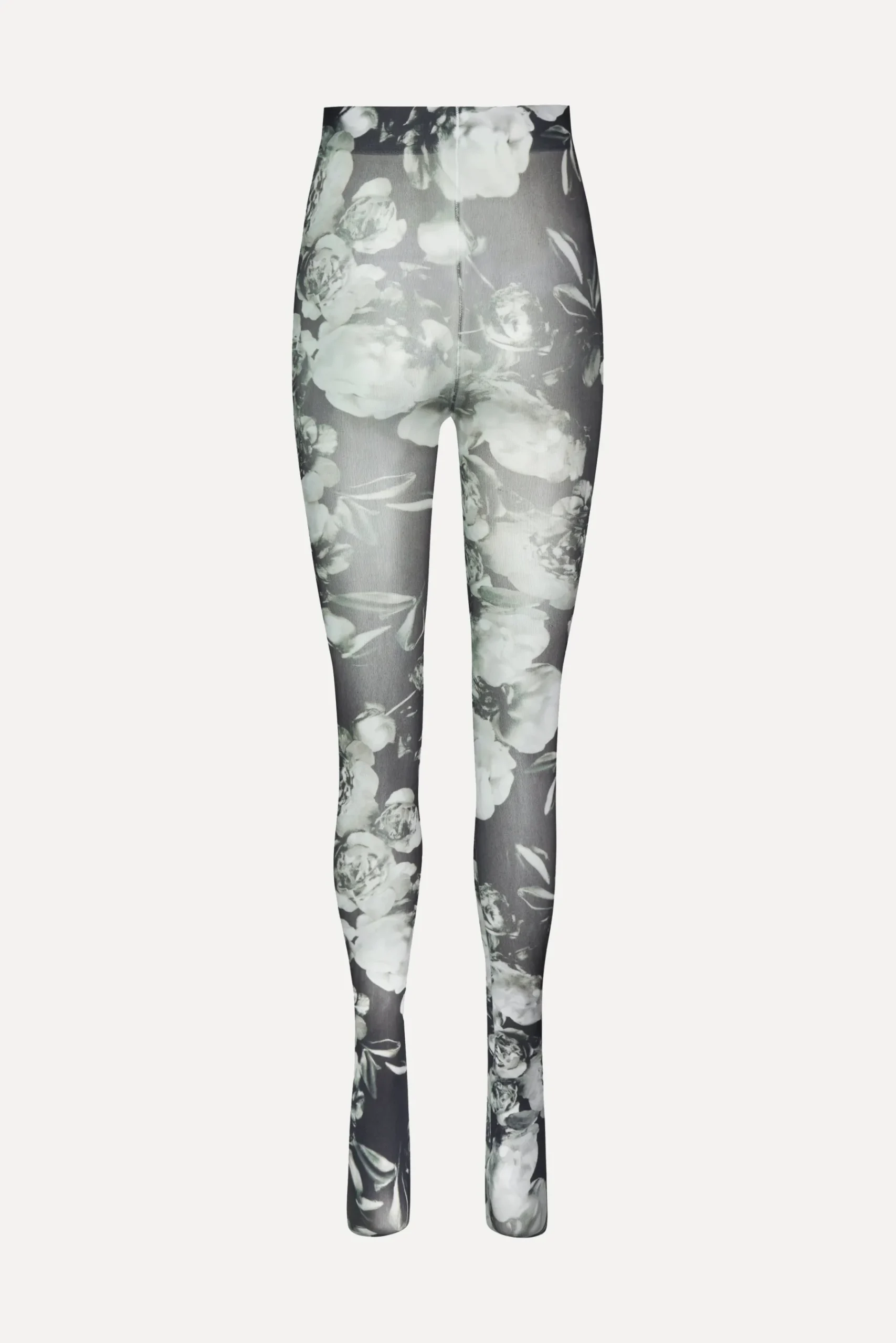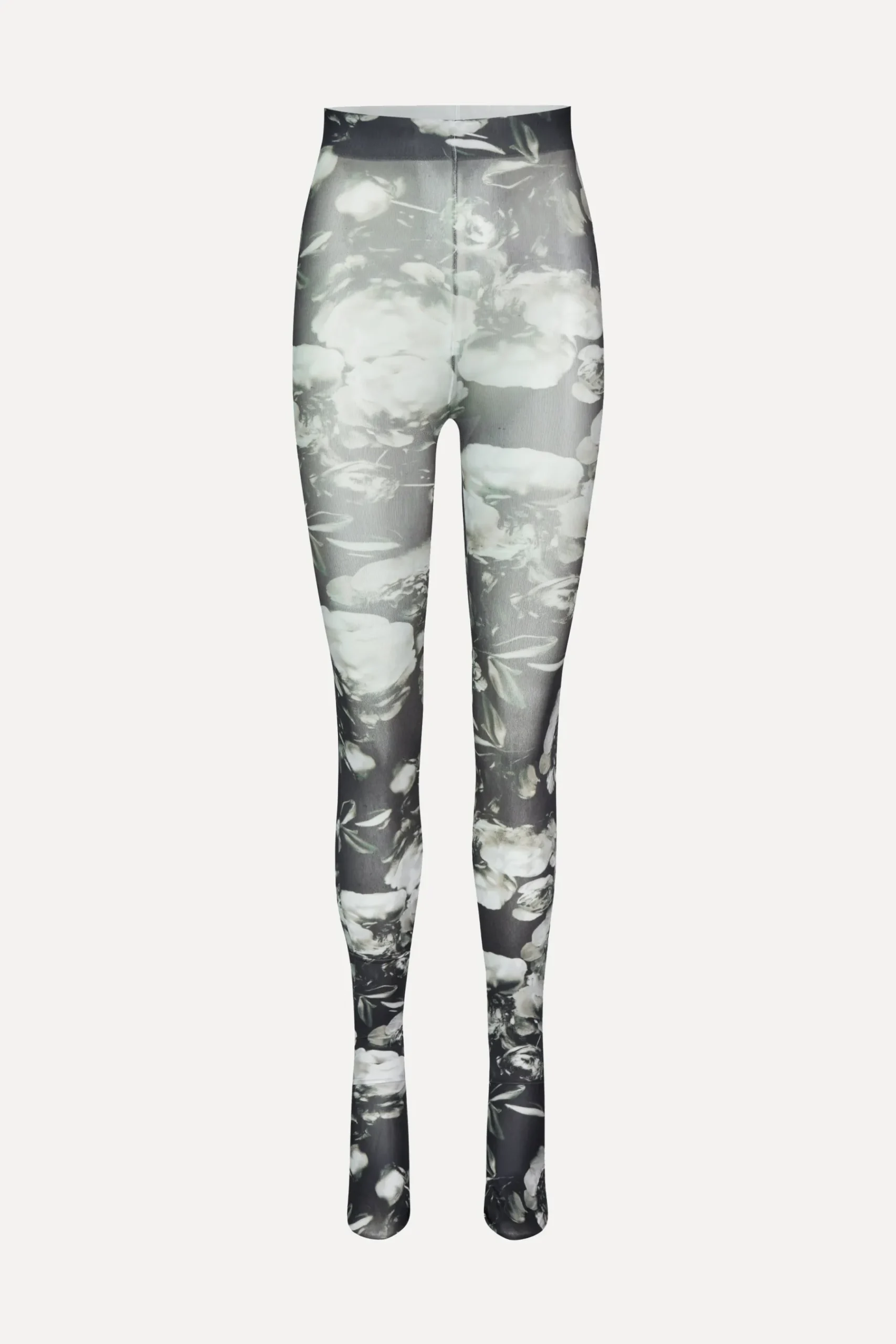 Højtaljede strømpebukser med sort og hvidt blomsterprint samt elastisk linning. Let og strækbart materiale.