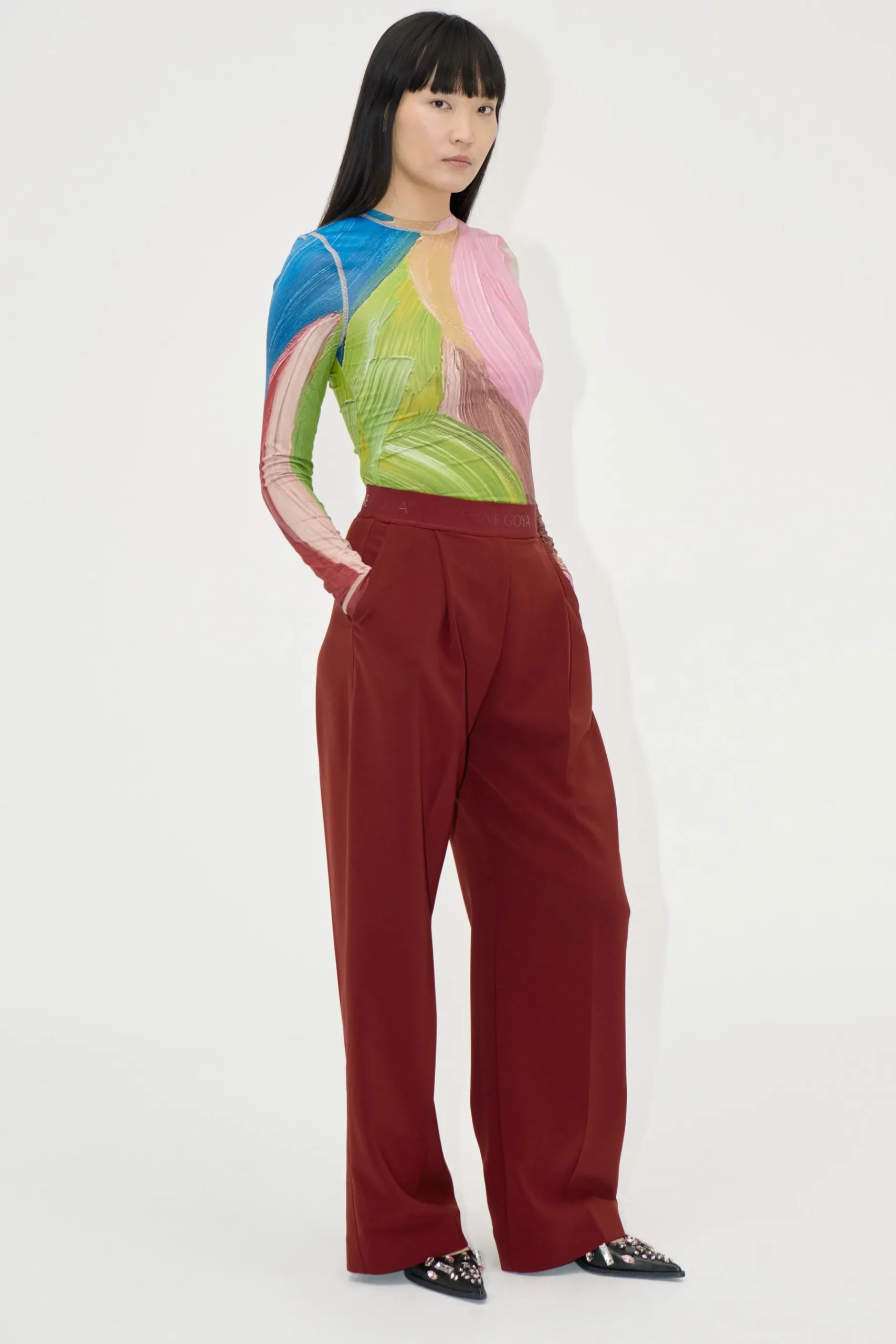 Bukser i en varm terracotta-farve med elastisk talje med STINE GOYA logo. Bukserne har læg foran, praktiske sidelommer samt en skjult lynlås i siden.
