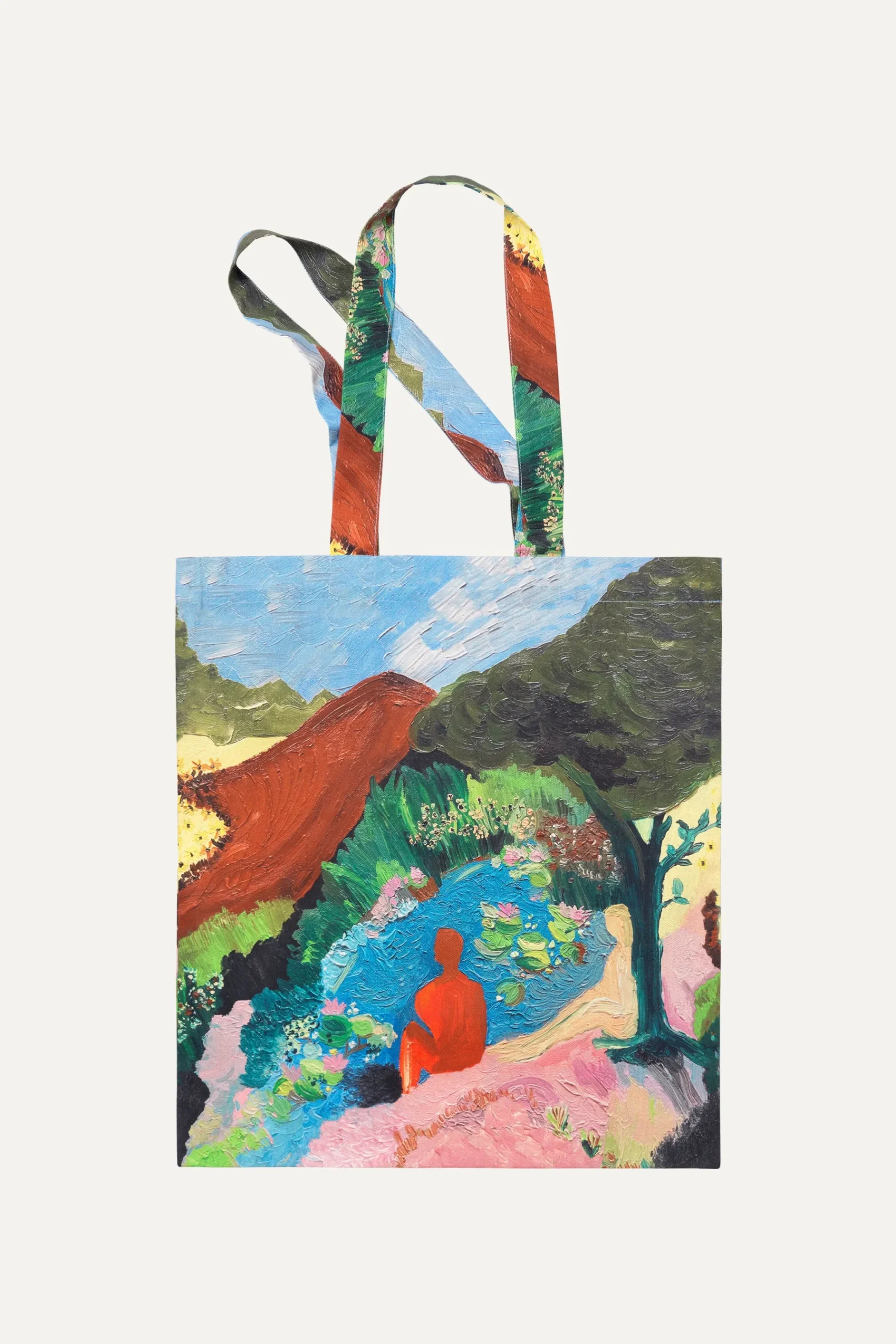 En klassisk tote bag, fremstillet af 100% økologisk bomuld, med et håndmalet abstrakt print og STINE GOYA logo.