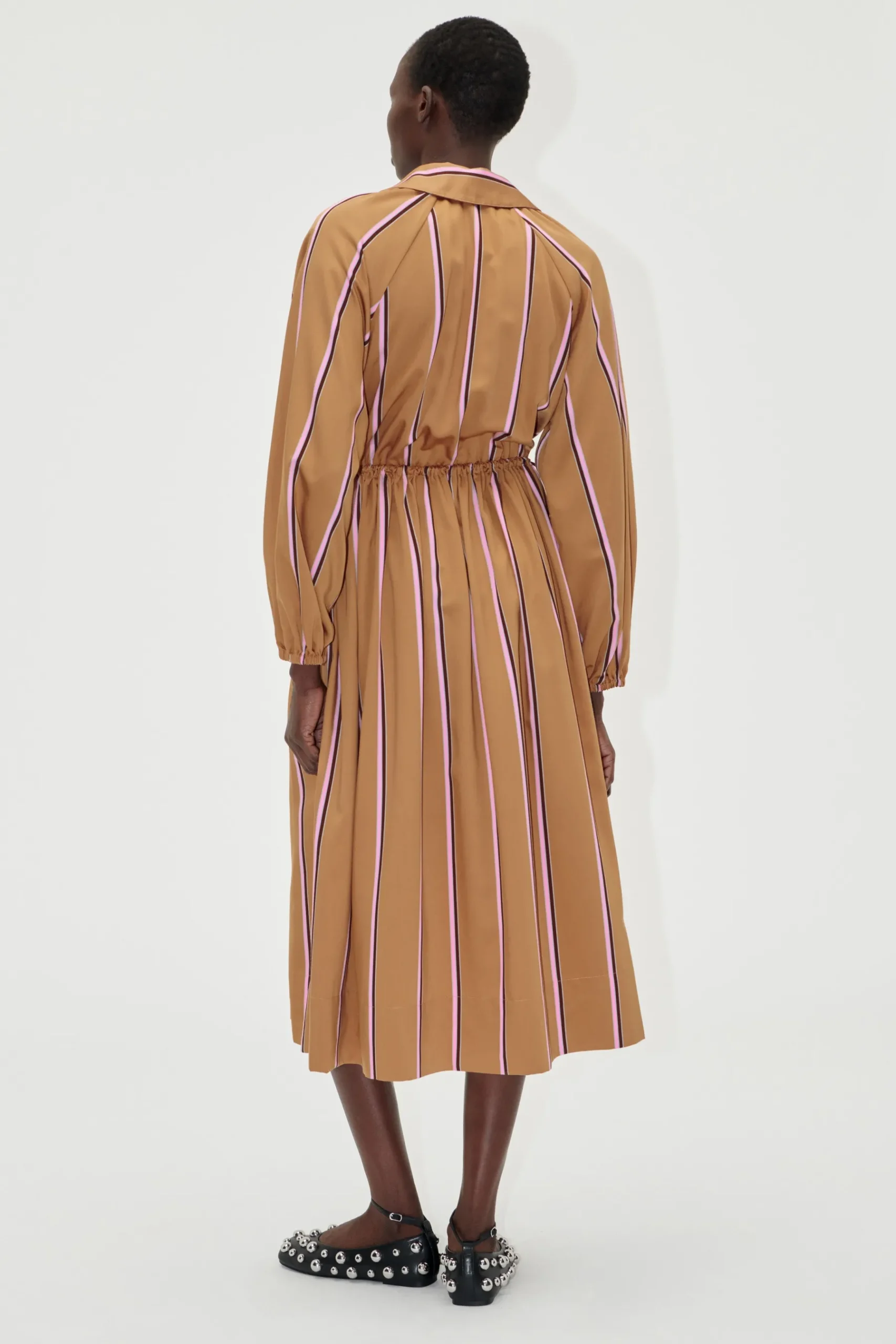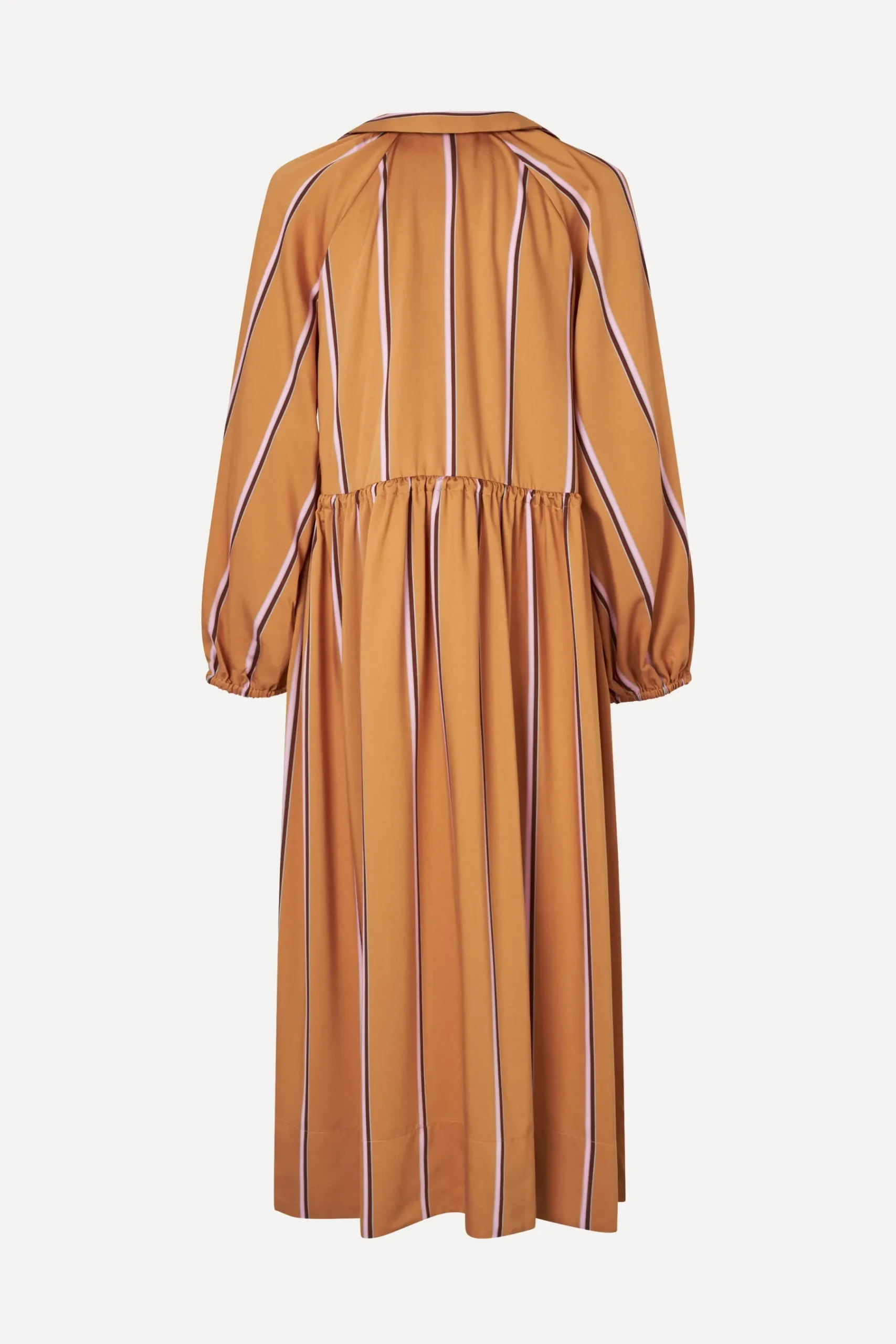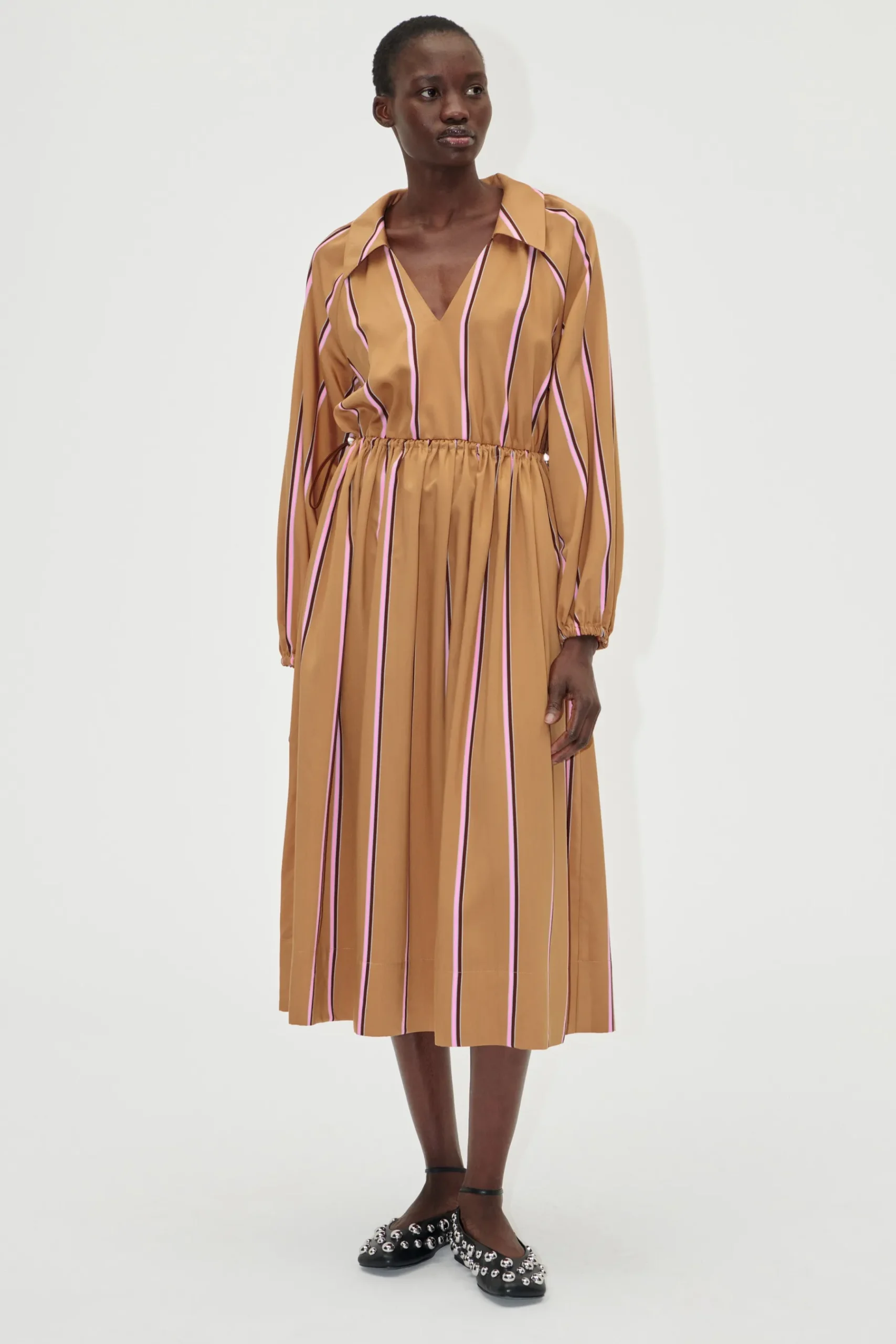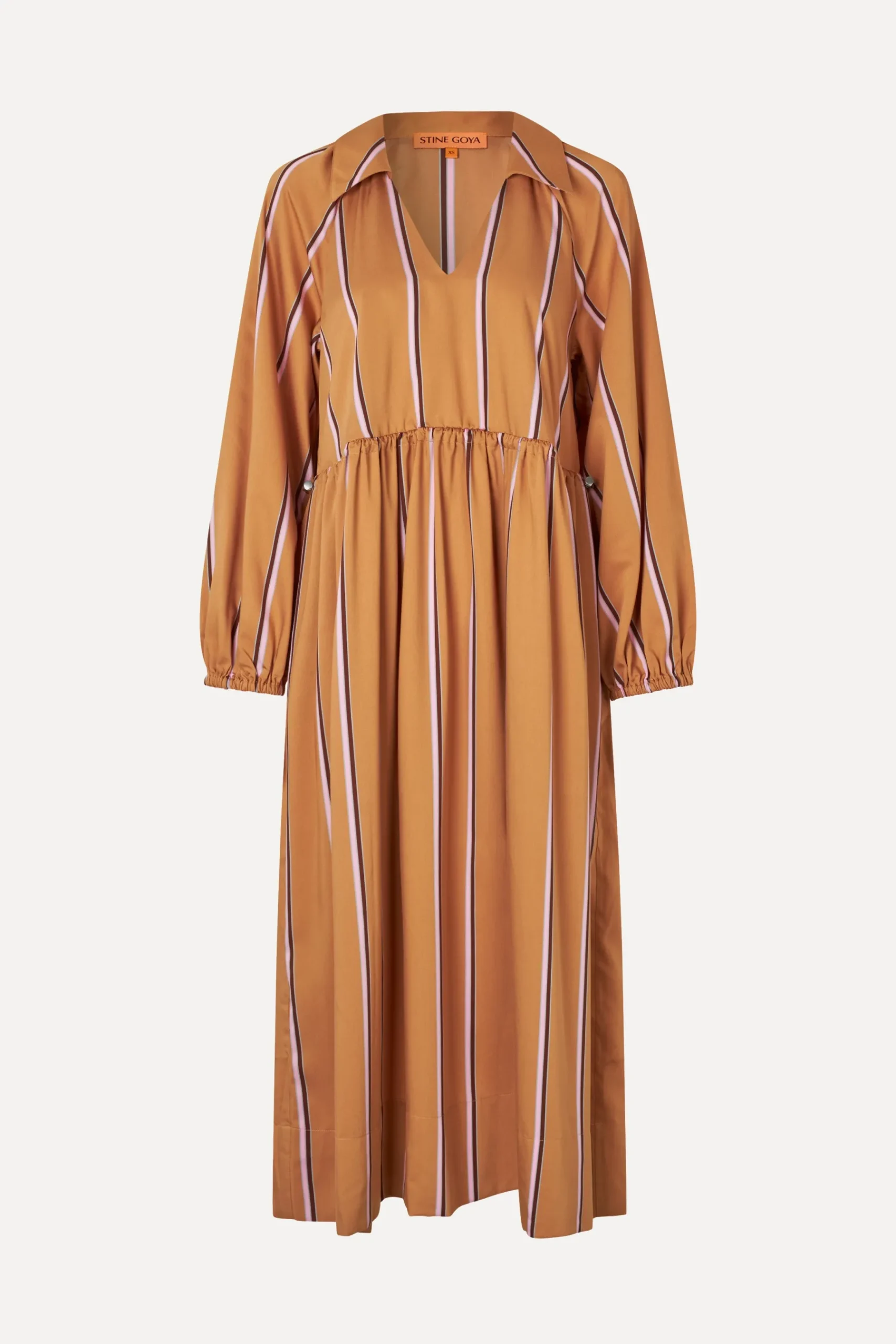 Stribet midi-kjole fremstillet i let ECOVERO™ viskosekvalitet med lange ærmer, sidelommer, V-hals med krave og elastisk talje, der kan strammes ind.