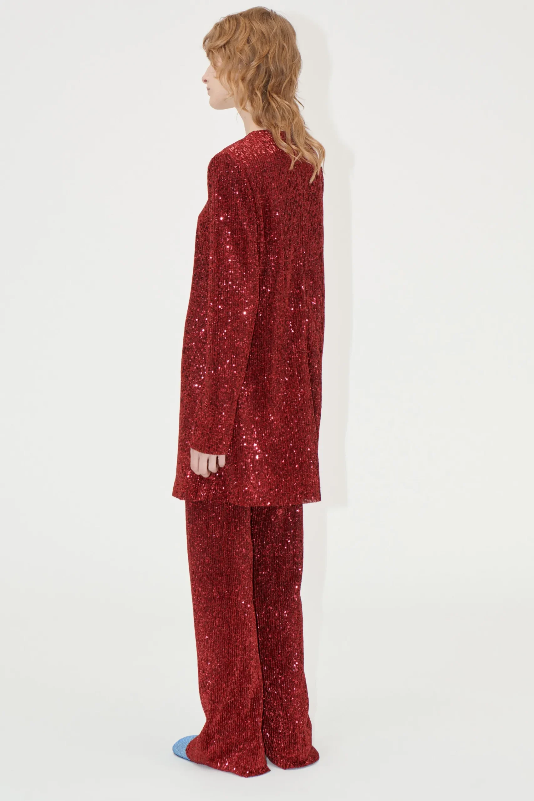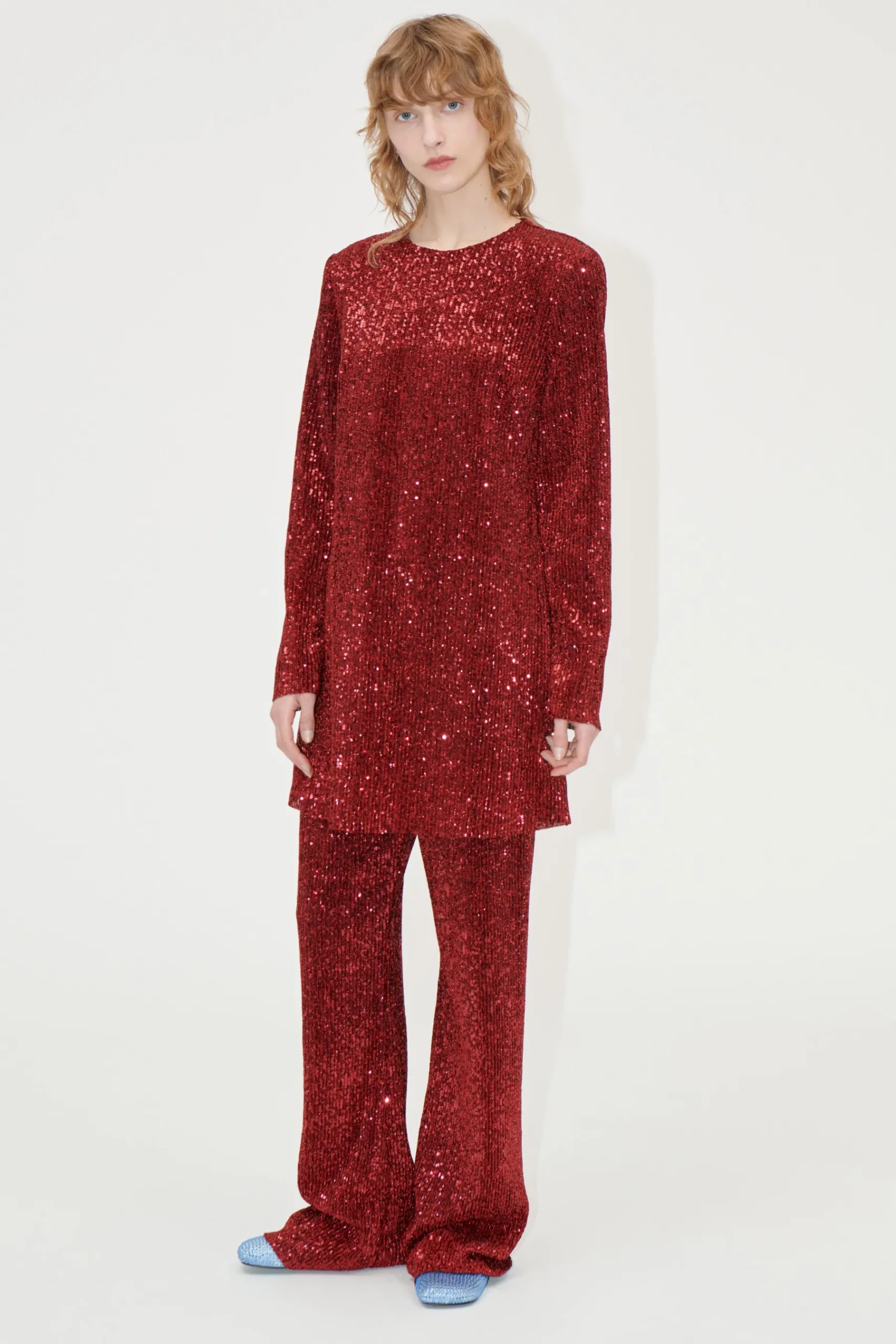 Denne pailletkjole i dyb rød har lange ærmer, en A-formet silhuet og rund halsudskæring. Kjolen er fuldt dækket af skinnende pailletter og har en skjult lynlåslukning i ryggen. Helforet for ekstra komfort.
