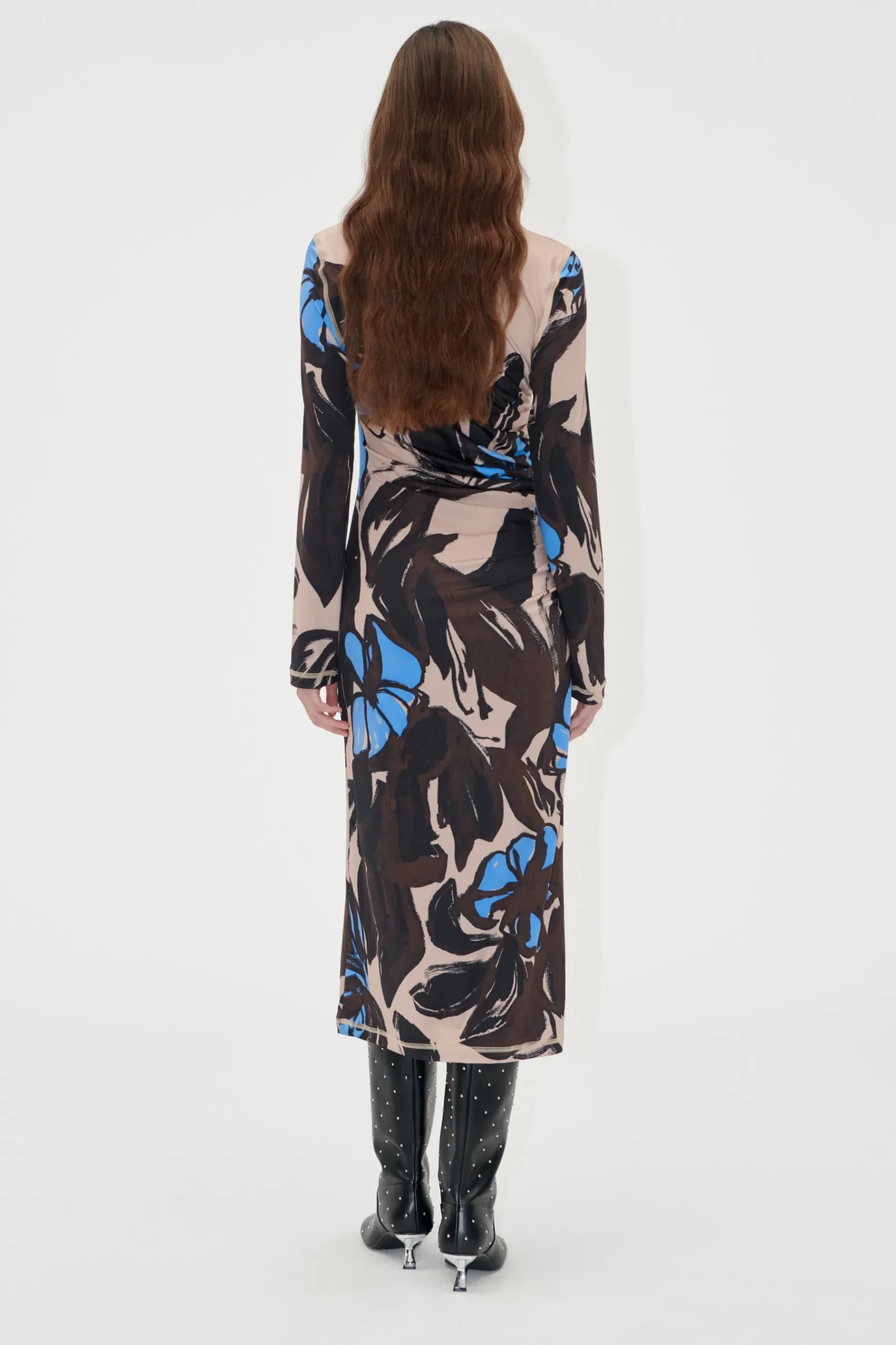 Kropsnær midi-kjole i jersey med et abstrakt blomsterprint, flatterende rynker i siderne, lange ærmer og rund halsudskæring.