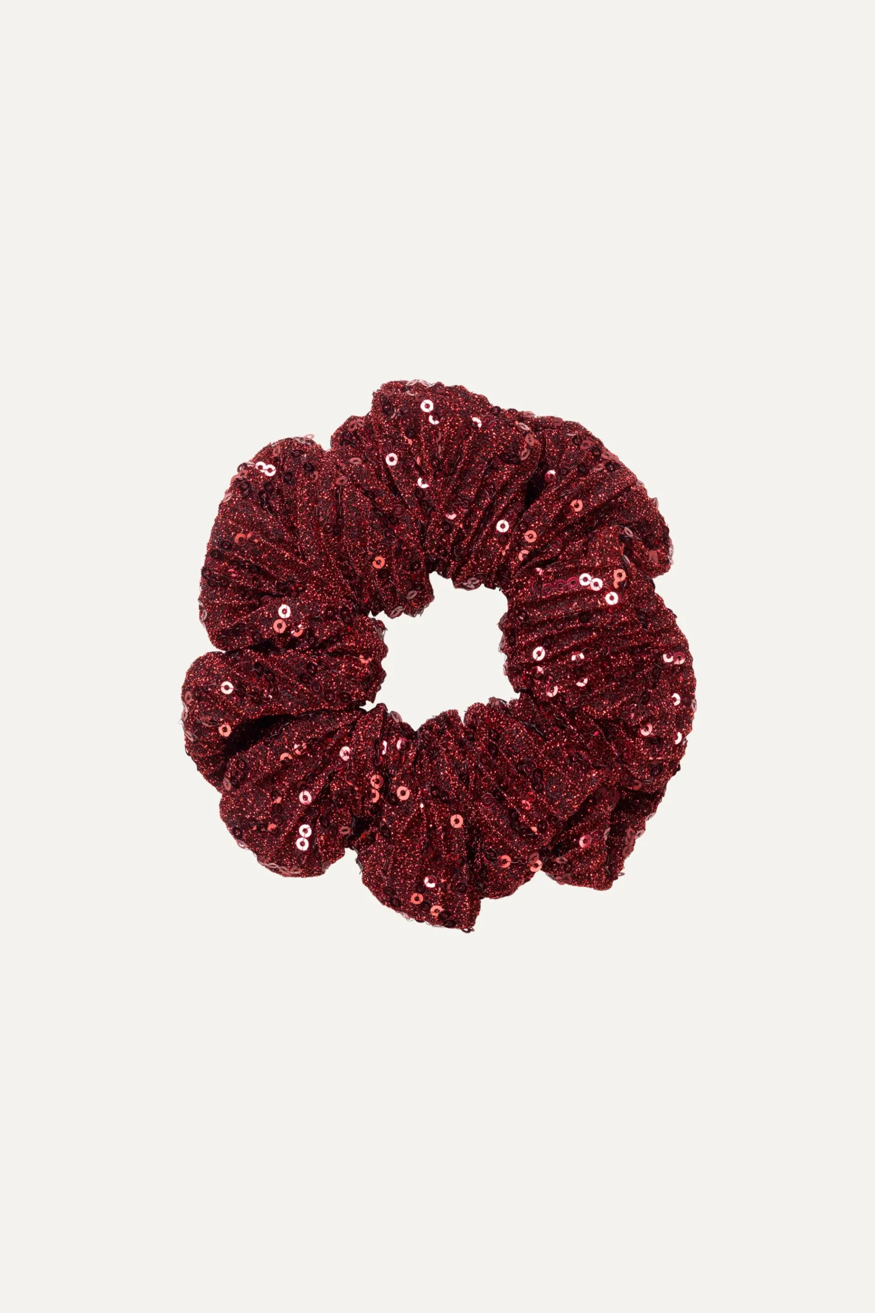 En oversized scrunchie med elastik, dekoreret med mørkerøde pailletter.