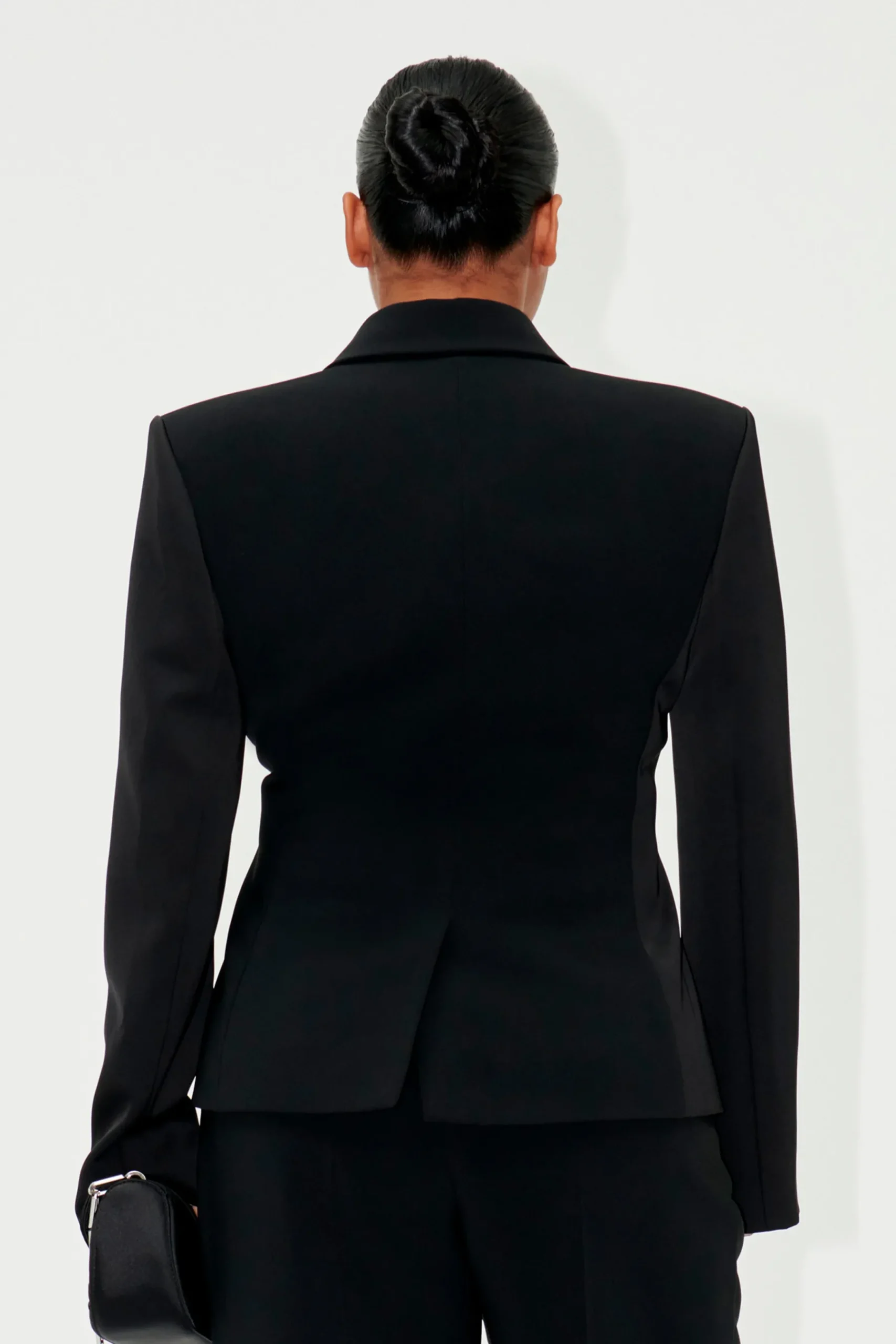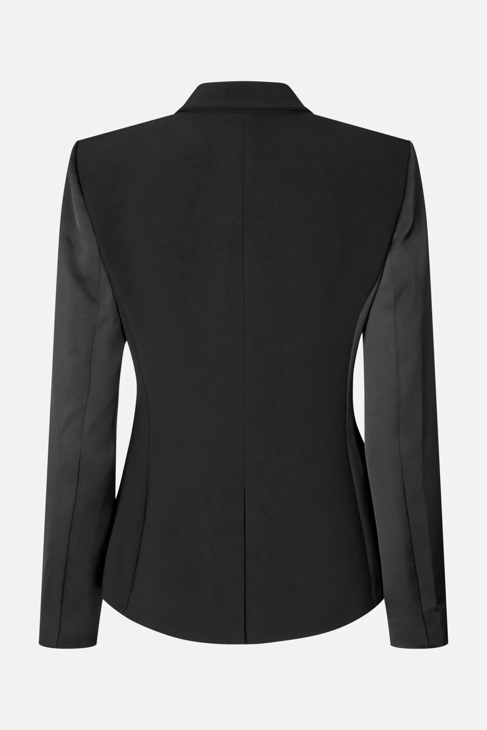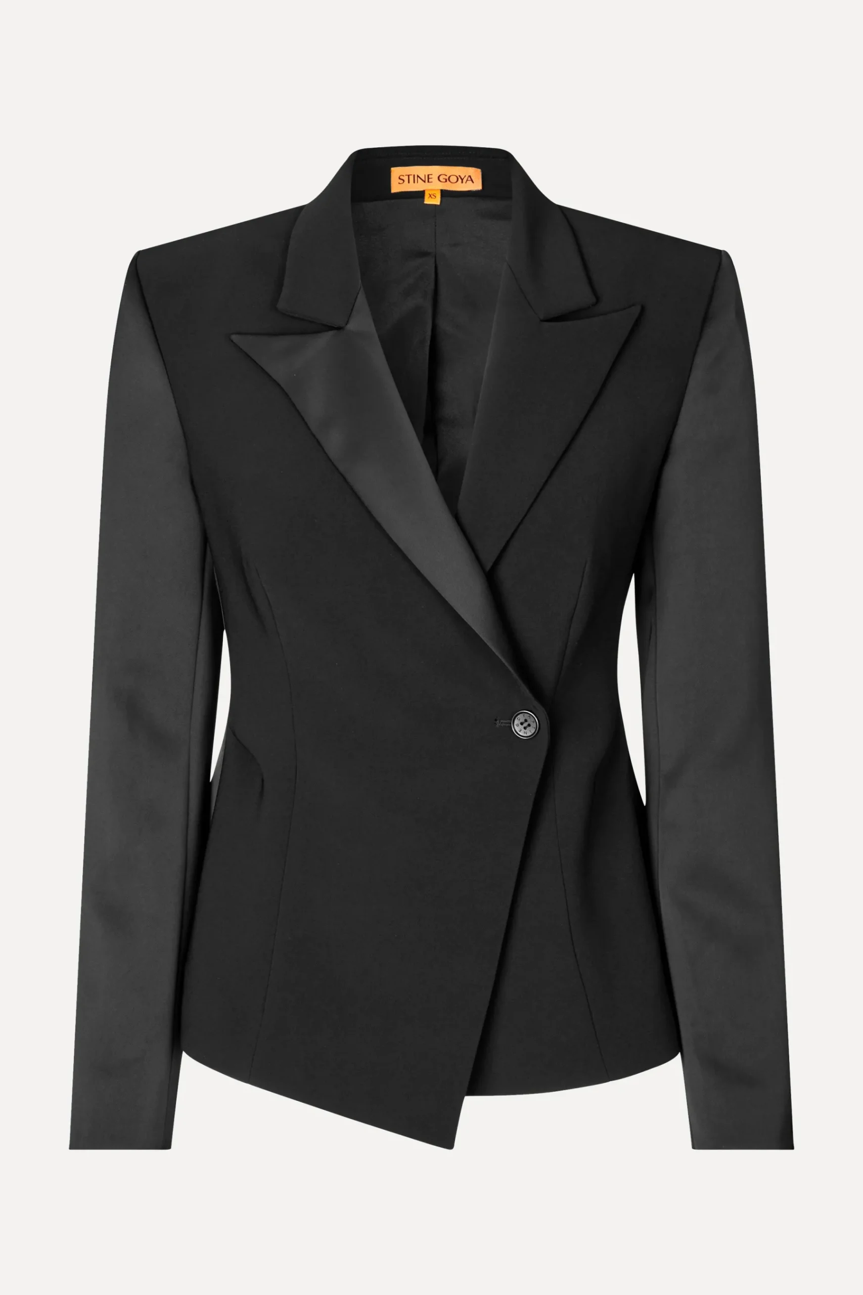 Struktureret enkeltradet sort blazer med asymmetrisk kant, smal høj talje og satinrevers og ærmedetaljer.