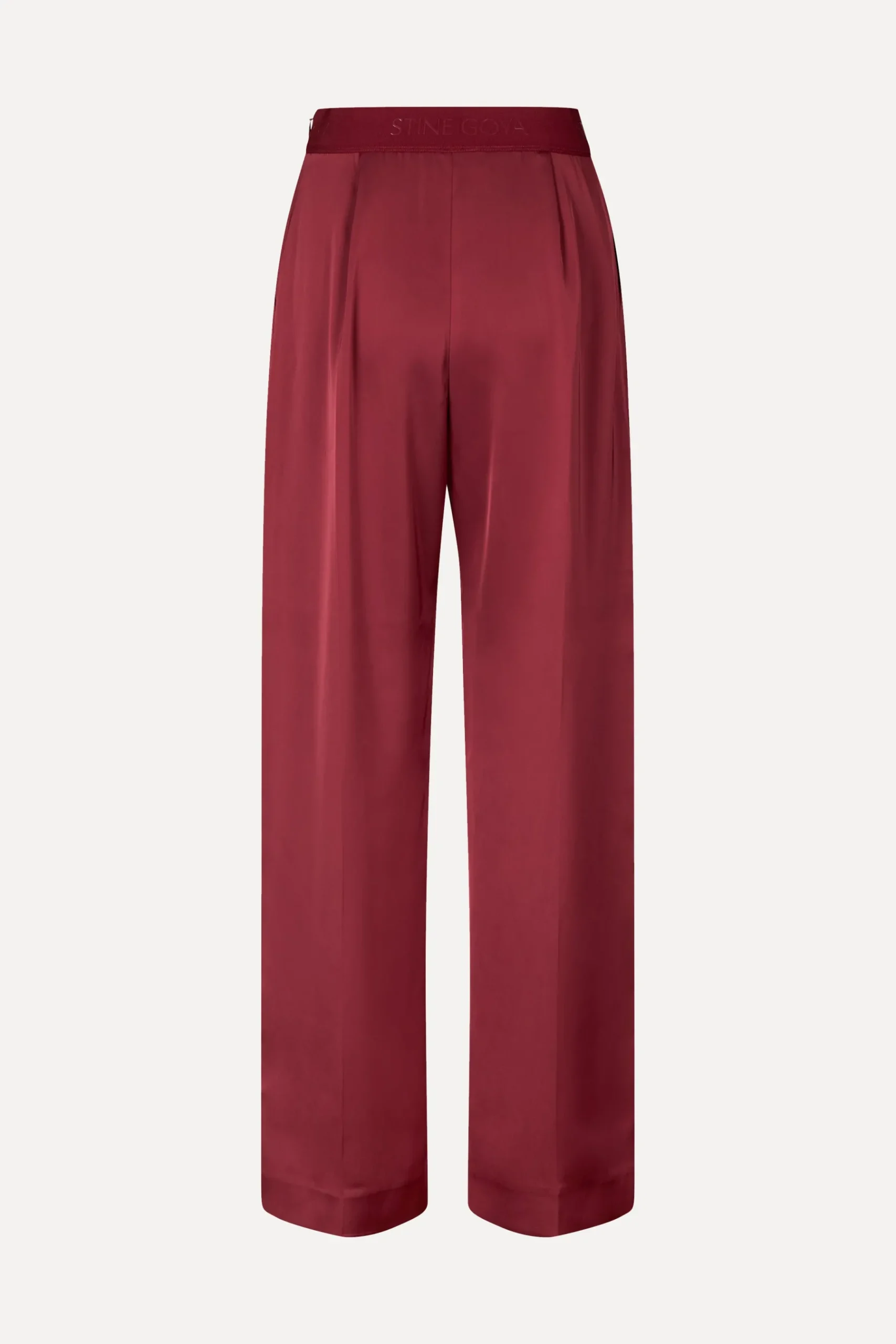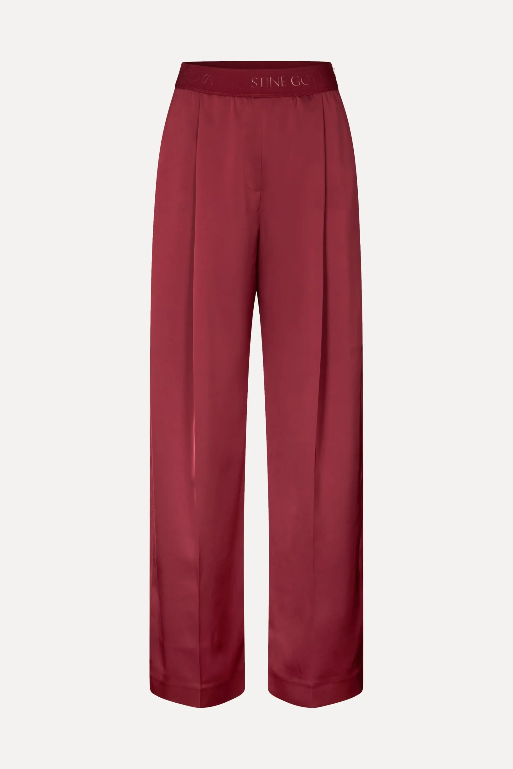Røde bukser i satin med brede, lige ben, læg og elastik i taljen med STINE GOYA logo. Detaljeret med sidelommer. Skjult lynlåslukning i siden.