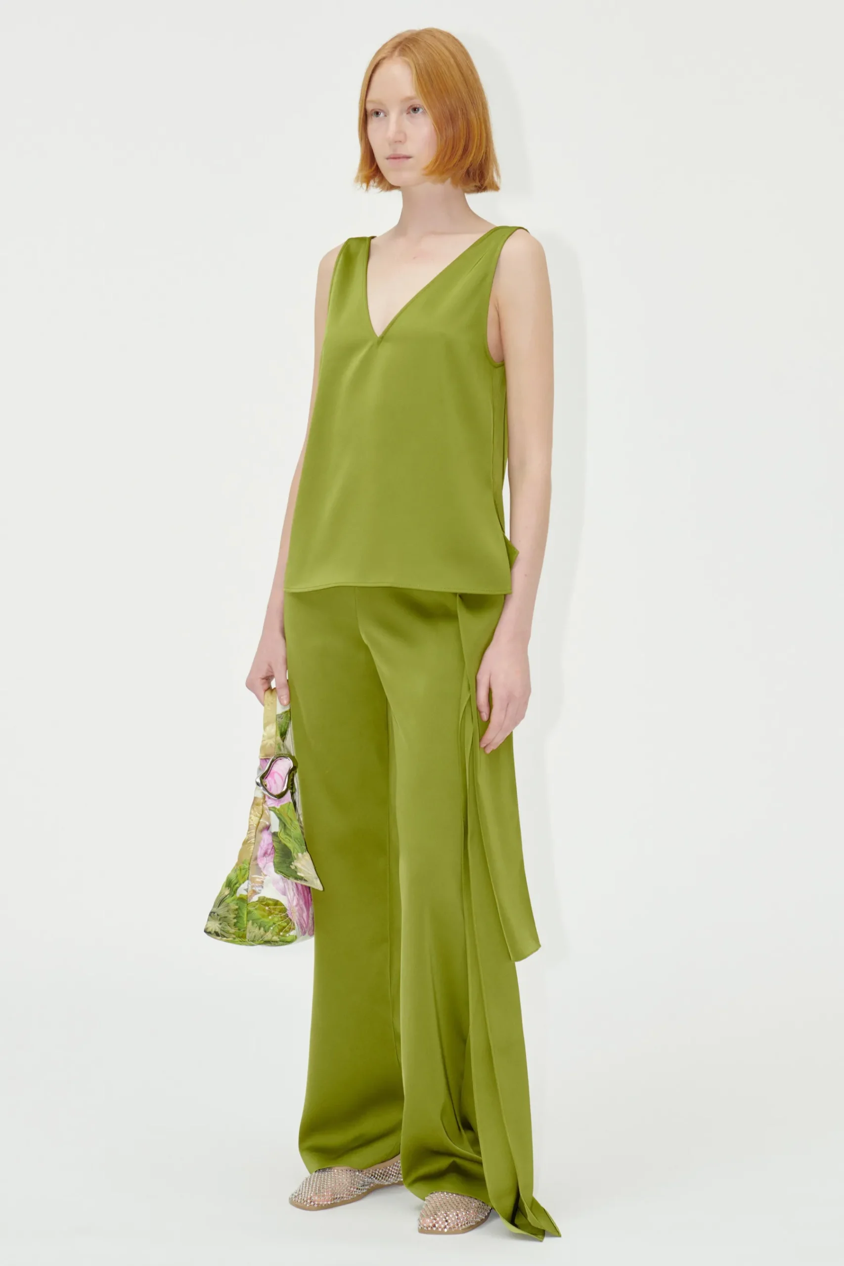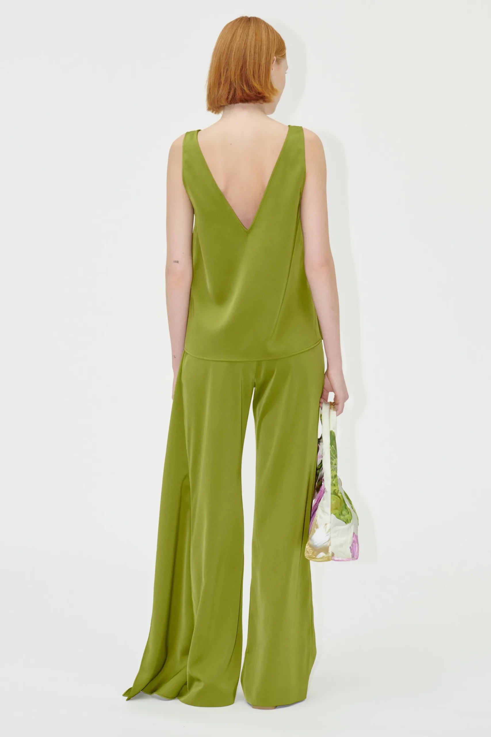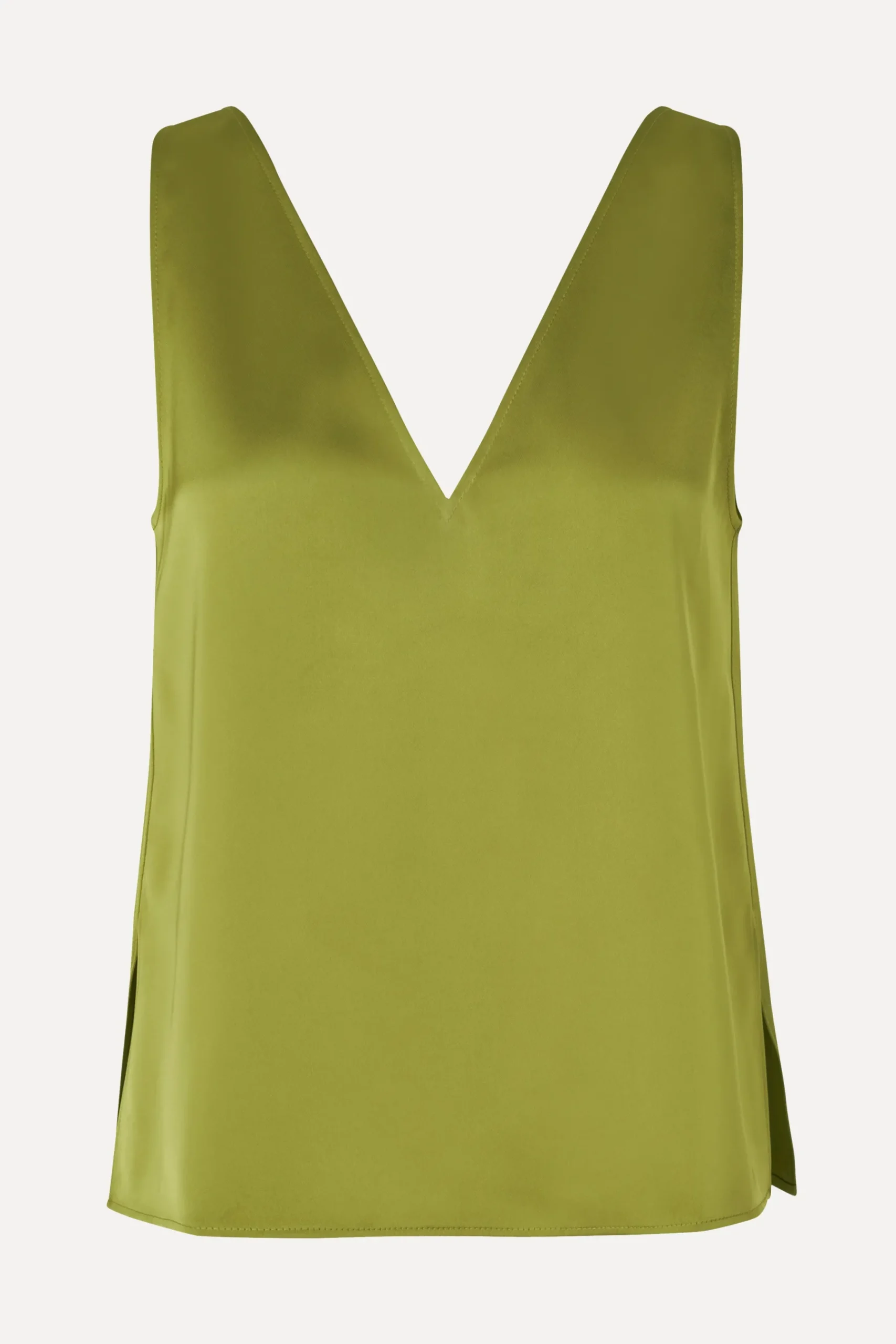 Grøn ærmeløs tanktop i satin med brede stropper og V-hals foran og bagpå.