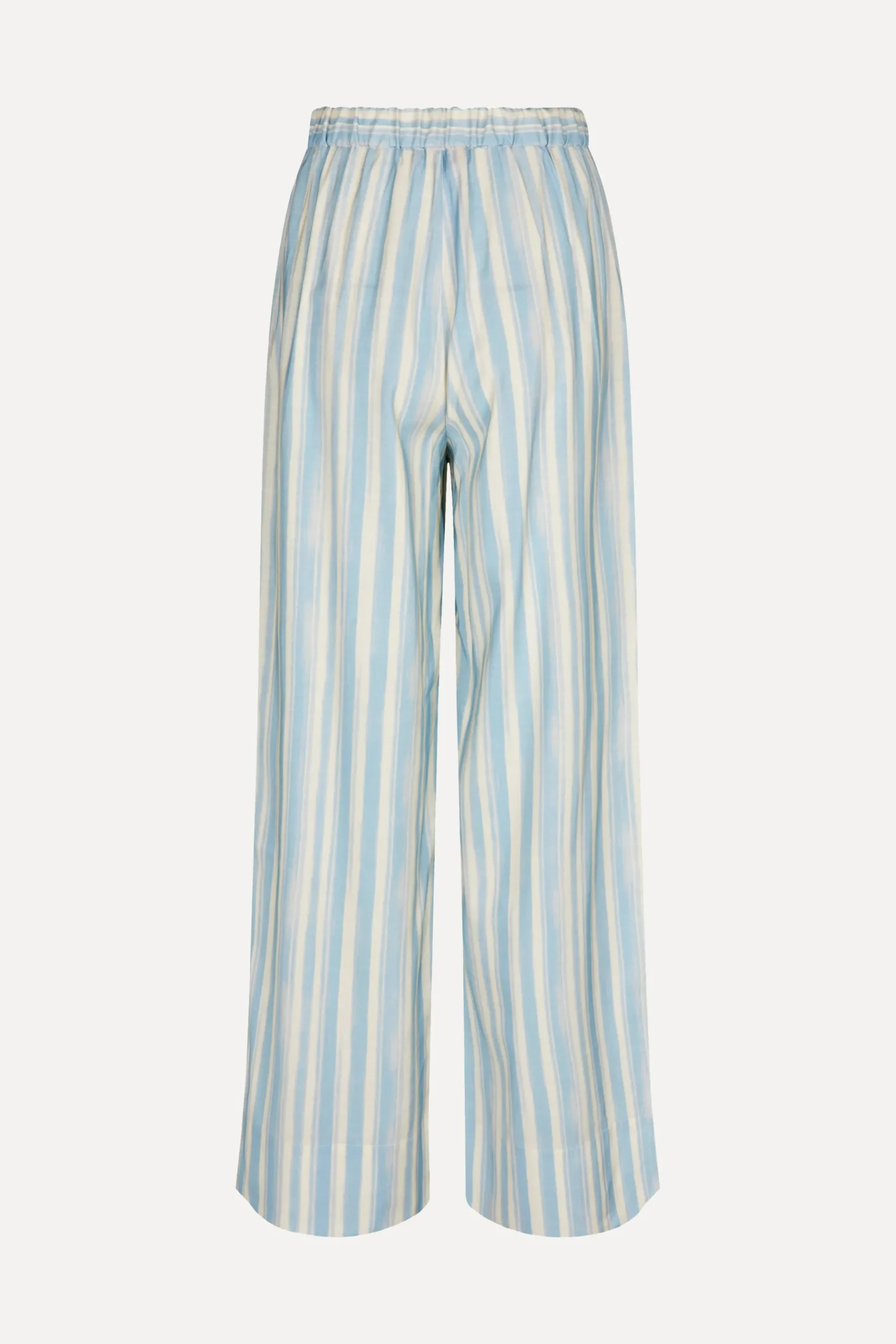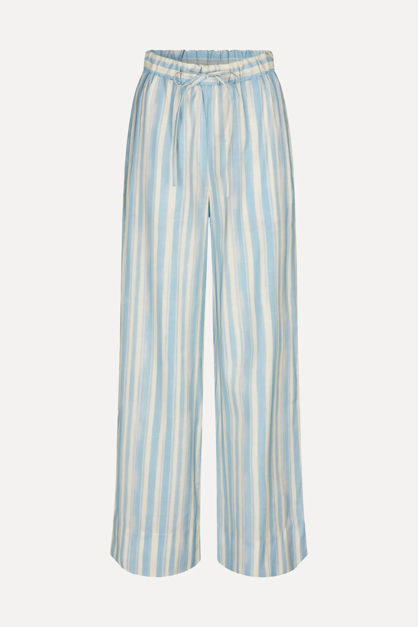 Afslappede lyse bukser med løs pasform i vævet kvalitet af ECOVERO™ Viskose med lyseblå striber. Høj talje med beklædt elastik og smal snøre. Skrå sidelommer og vide, lige ben.