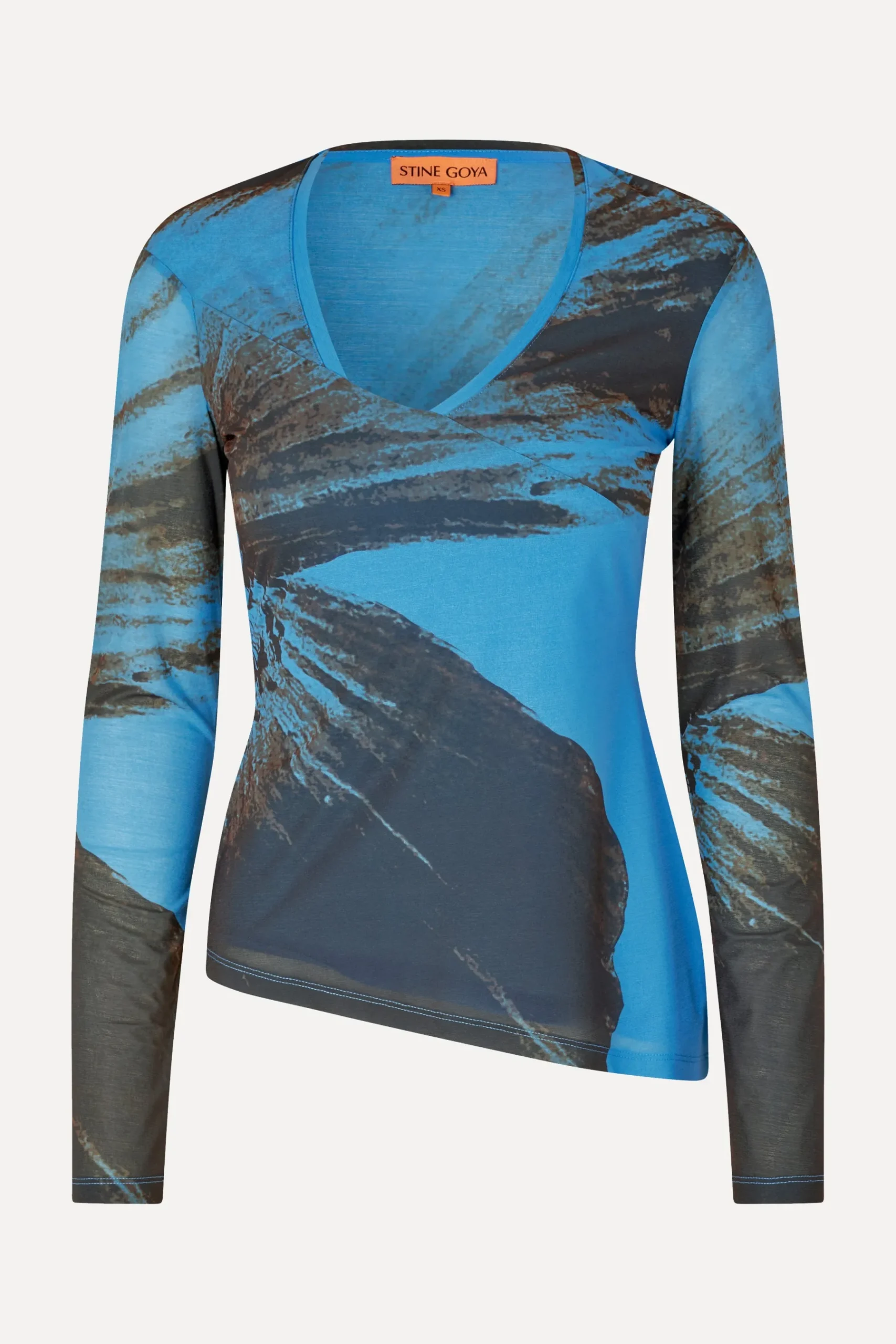 Blød, figursyet top med lange ærmer, abstrakt mønster og slå-om-effekt med asymmetrisk kant forneden.