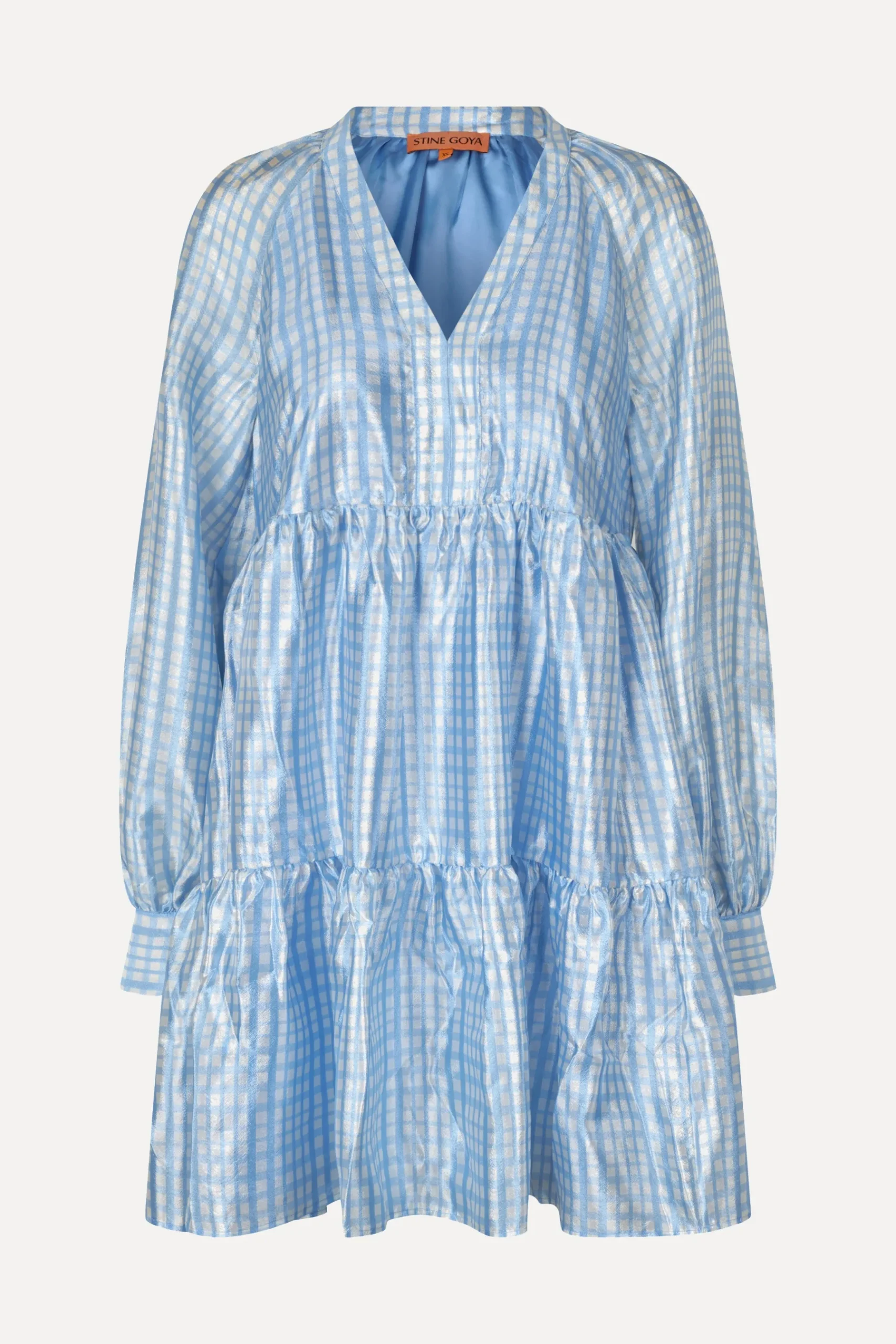 Afslappet mini-kjole med lyseblå og hvide tern. Med høj krave, V-udskæring og lange pufærmer med manchetter. Detaljeret med sidelommer. Foret.