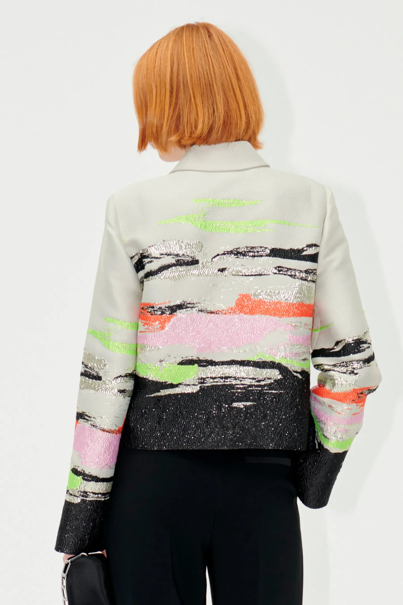 Kort jakke i en kraftig jacquard vævet kvalitet med striber og metalliske detaljer. Detaljeret med krave, lange ærmer og knaplukning foran. Helforet med STINE GOYA logo foer.