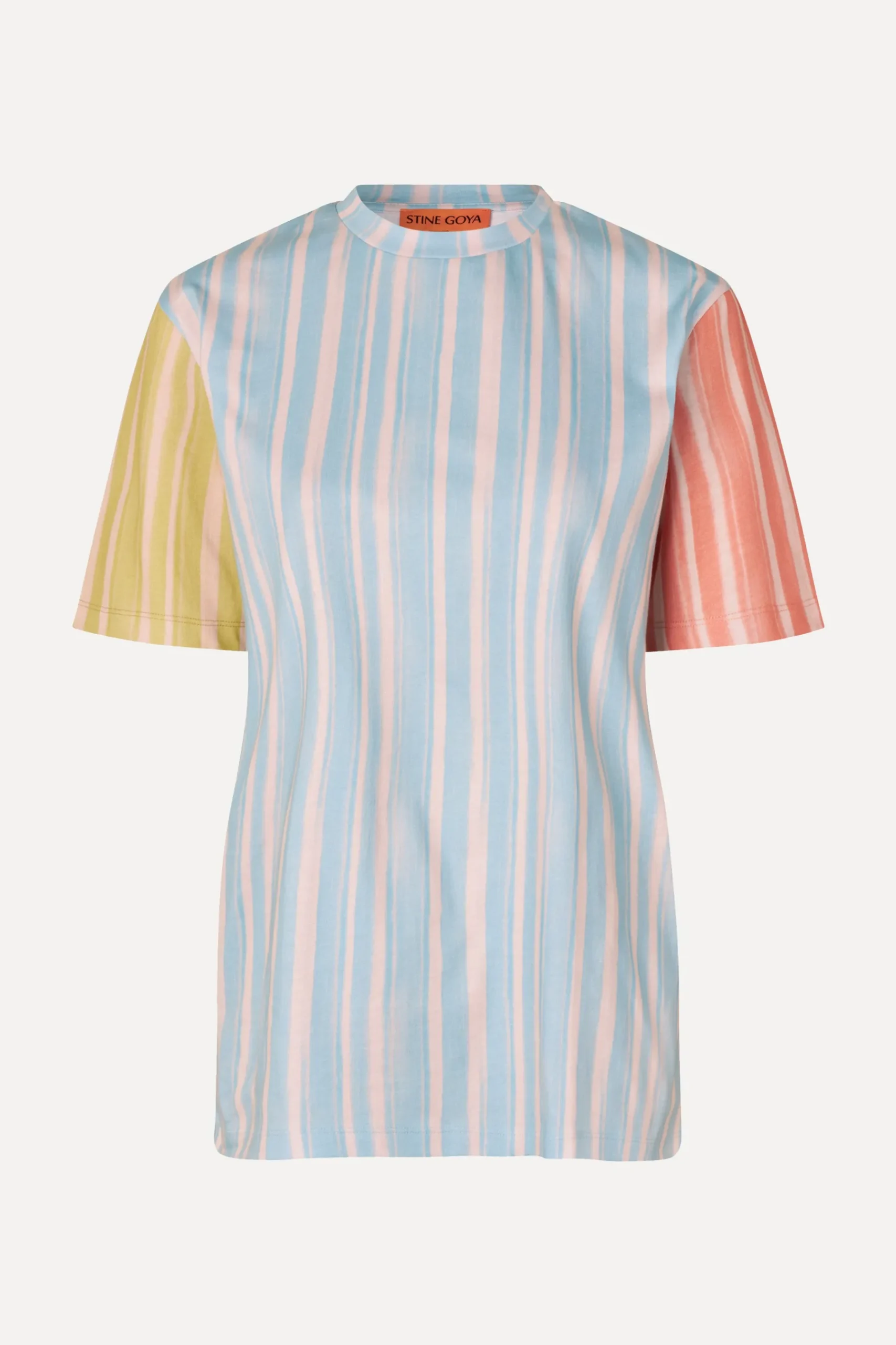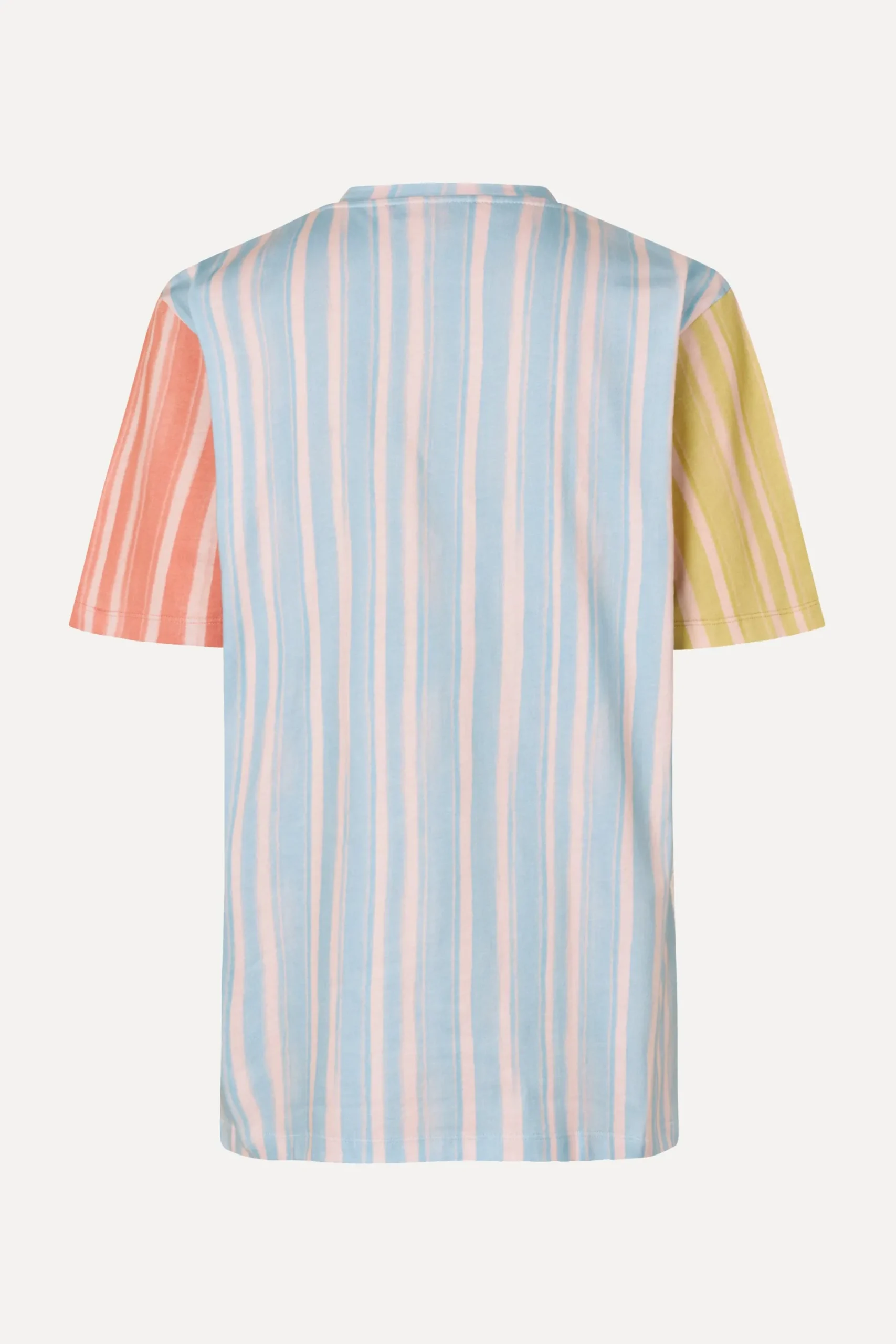 Afslappet t-shirt i økologisk bomuld med håndmalede striber, korte ærmer og rund crew neck hals. Detaljeret med colour block design på ærmerne.