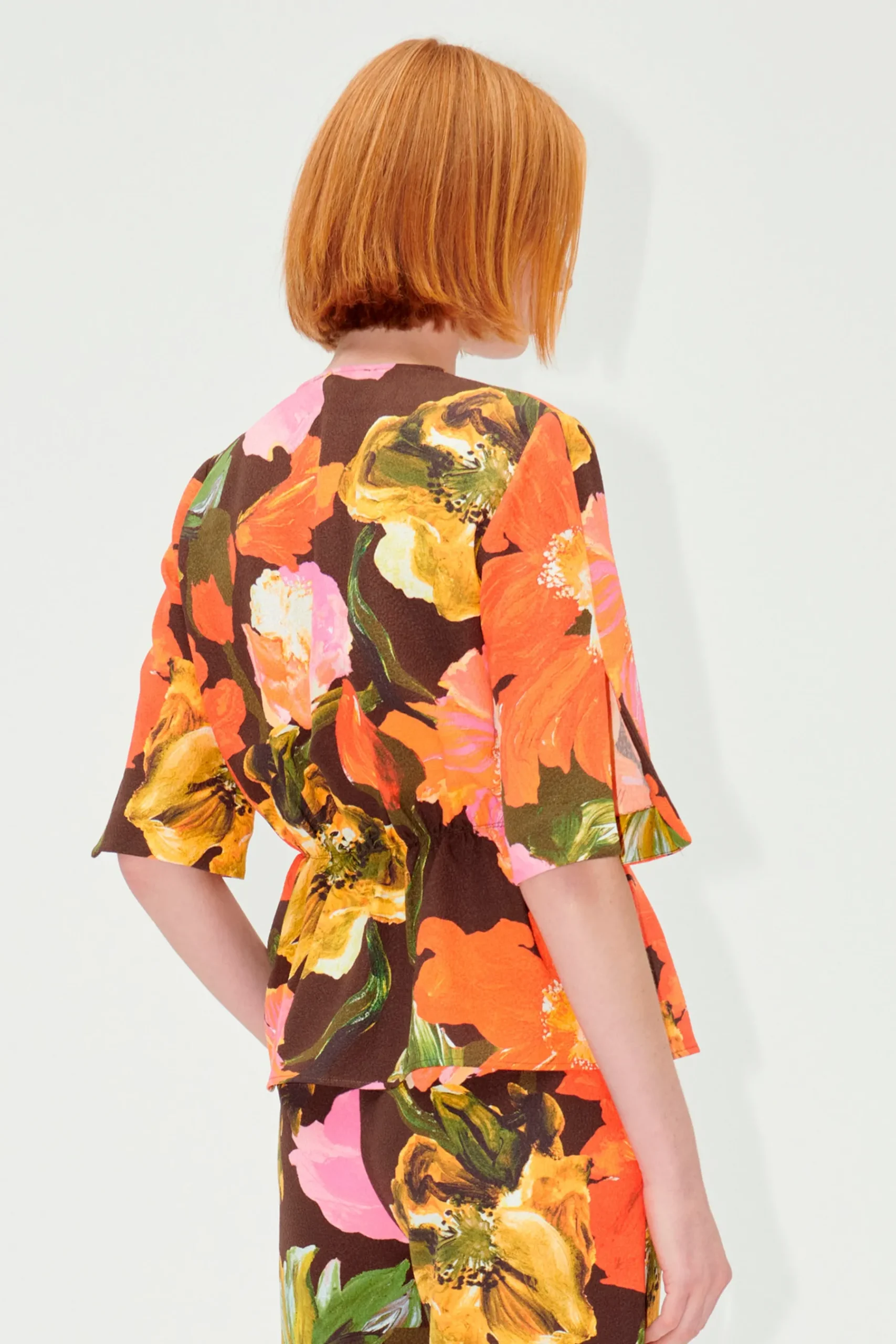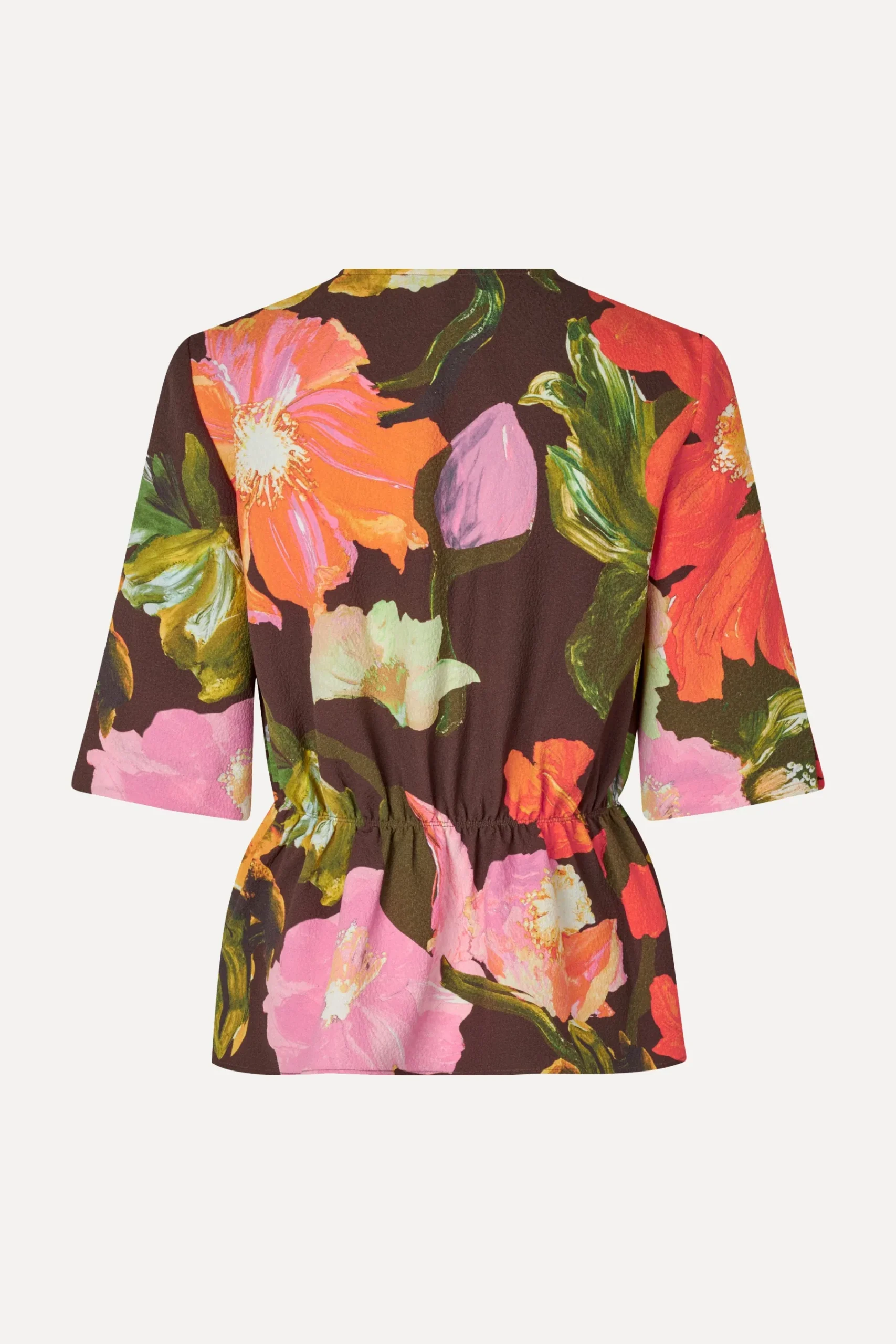 Peplum top med håndmalet blomsterprint, dyb V-udskæring, korte ærmer og elastik i taljen. Skab et fuldt look med de matchende bukser.