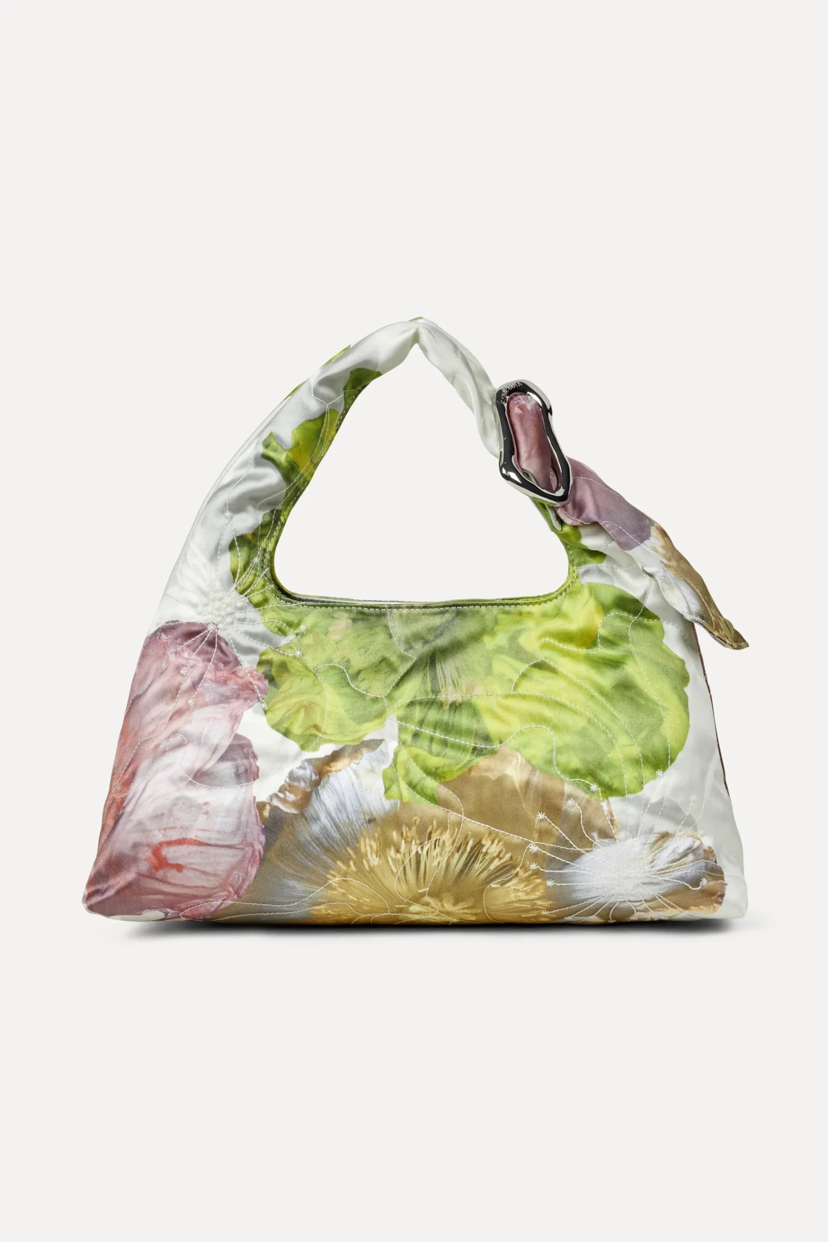 Struktureret hobo-taske med lynlåslukning, kort skulderrem med guldspænde og quiltet materiale med blomstermønster.