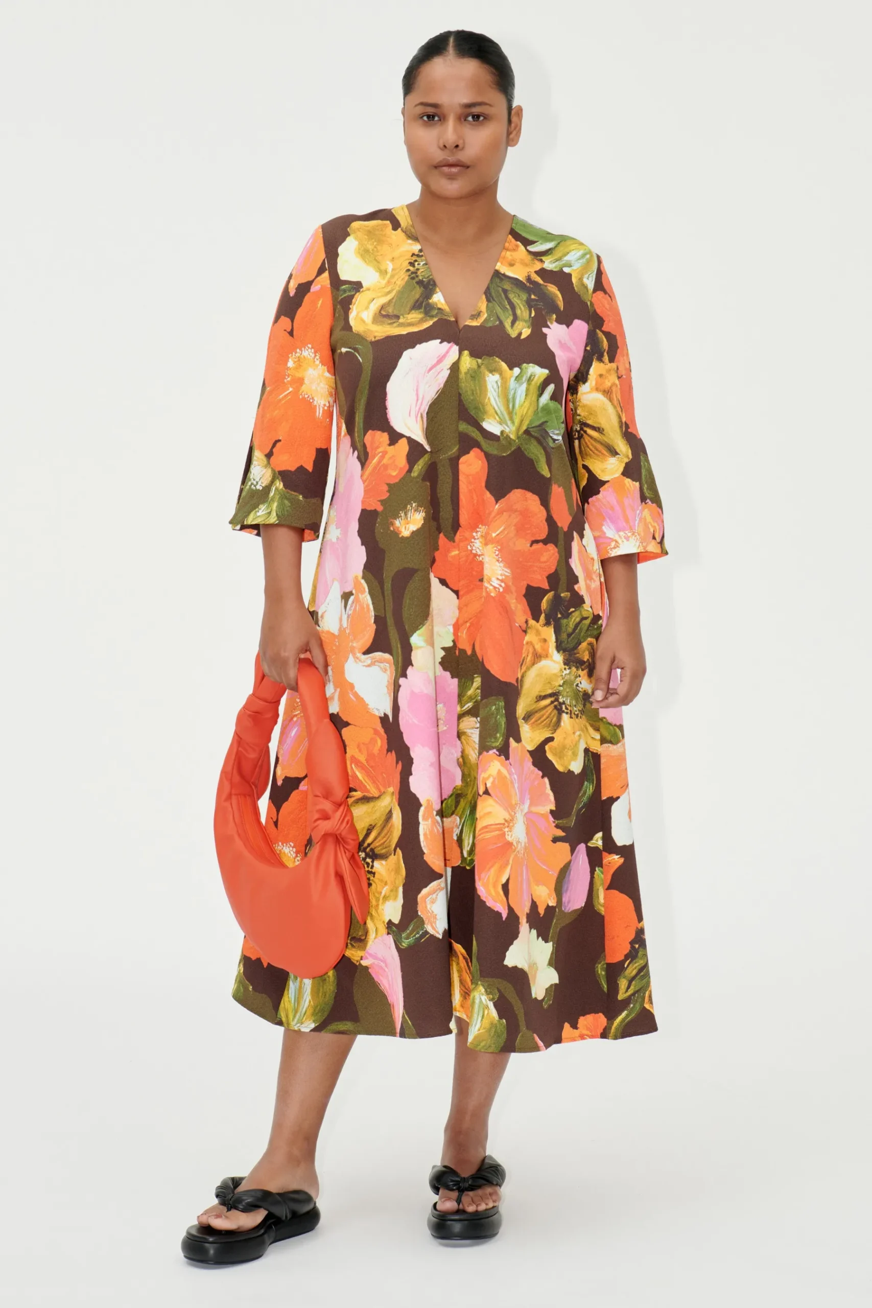 Oversized midi-kjole med håndmalet blomsterprint, albuelange ærmer, V-udskæring og flagrende skørt.