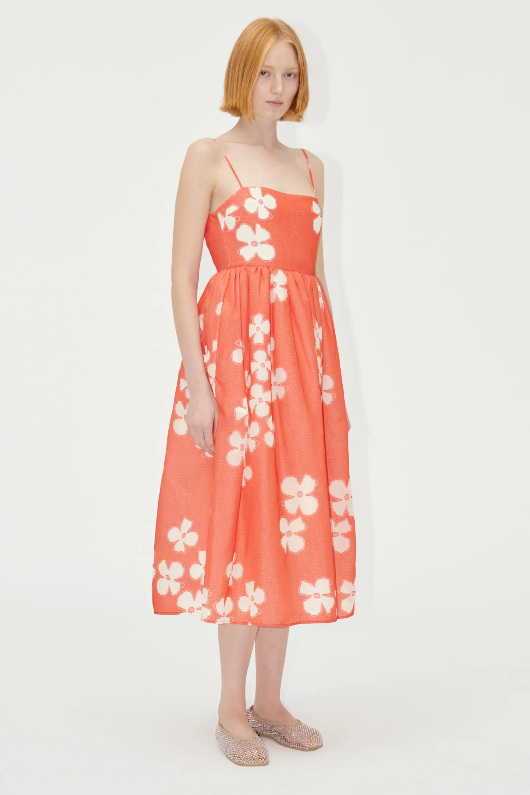 Koralfarvet midi-kjole med hvidt blomstermønster, tynde stropper, slank overdel og flagrende skørt med sidelommer. Fuldt foret.