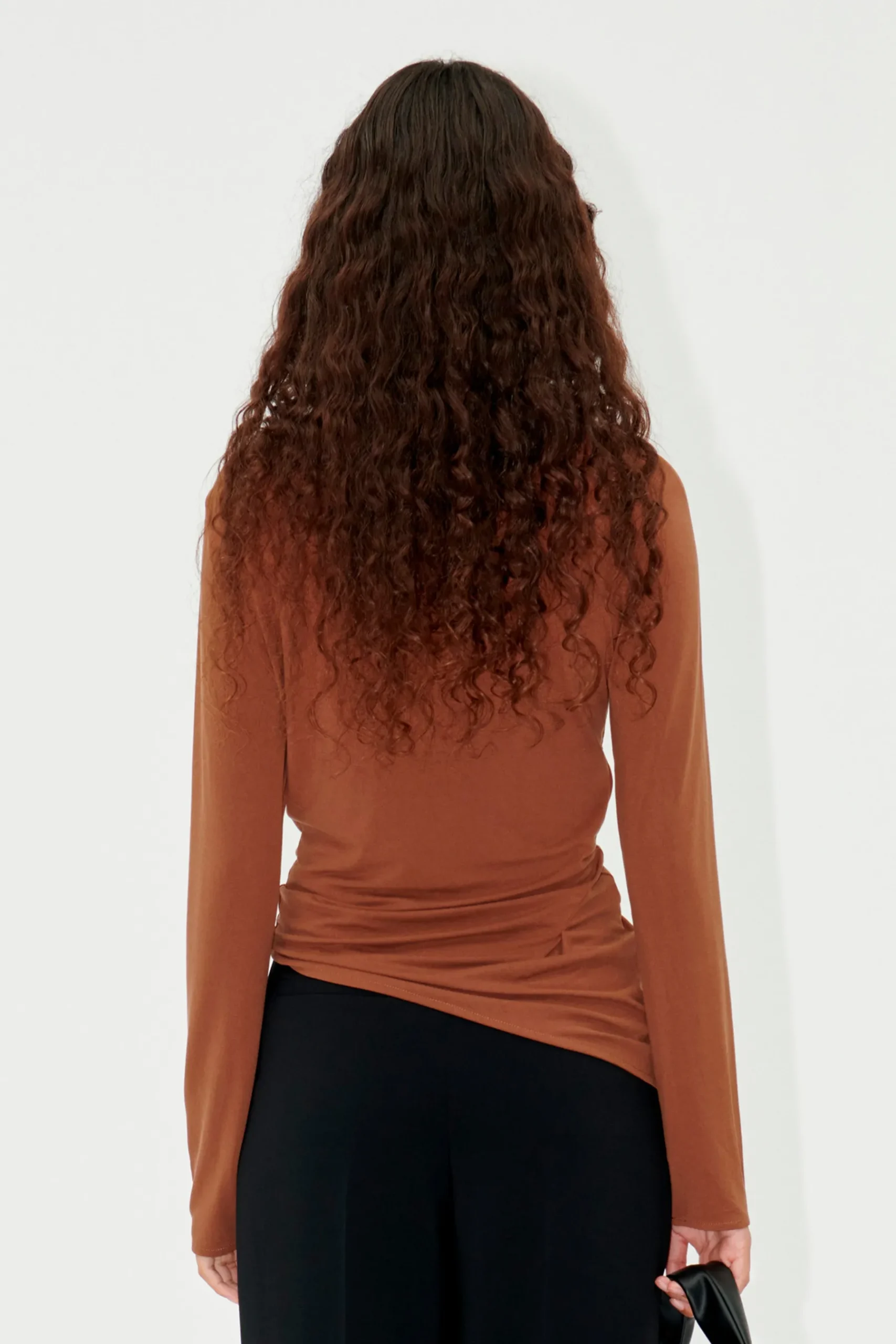 Moderne skrå top med lange ærmer, bådudskæring og draperet asymmetrisk kant forneden. Detaljer med guldspænde.