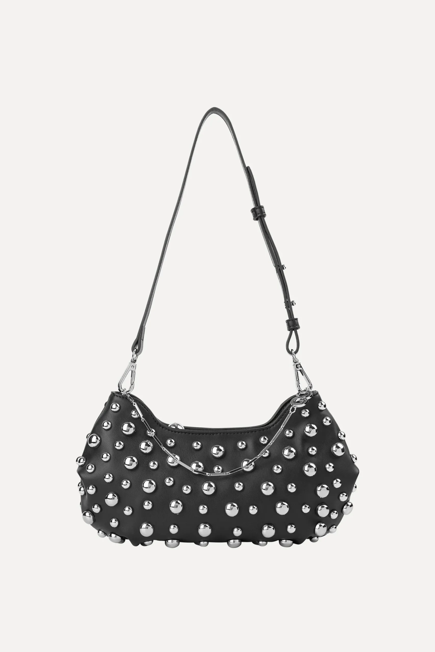 Skuldertaske i æblelæder med sølvfarvede nitter, lynlåslukning, aftagelig rem og delikat kæde med STINE GOYA logo.
