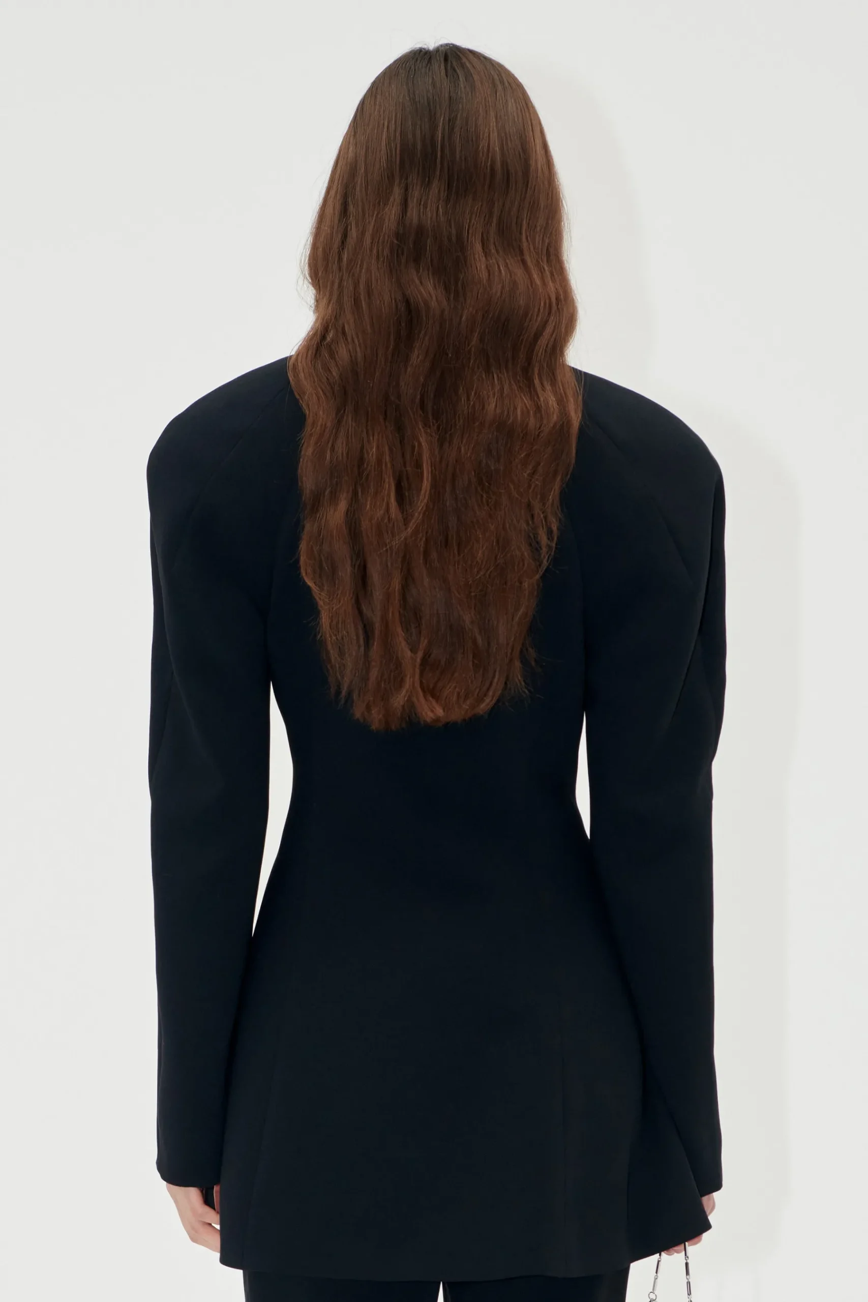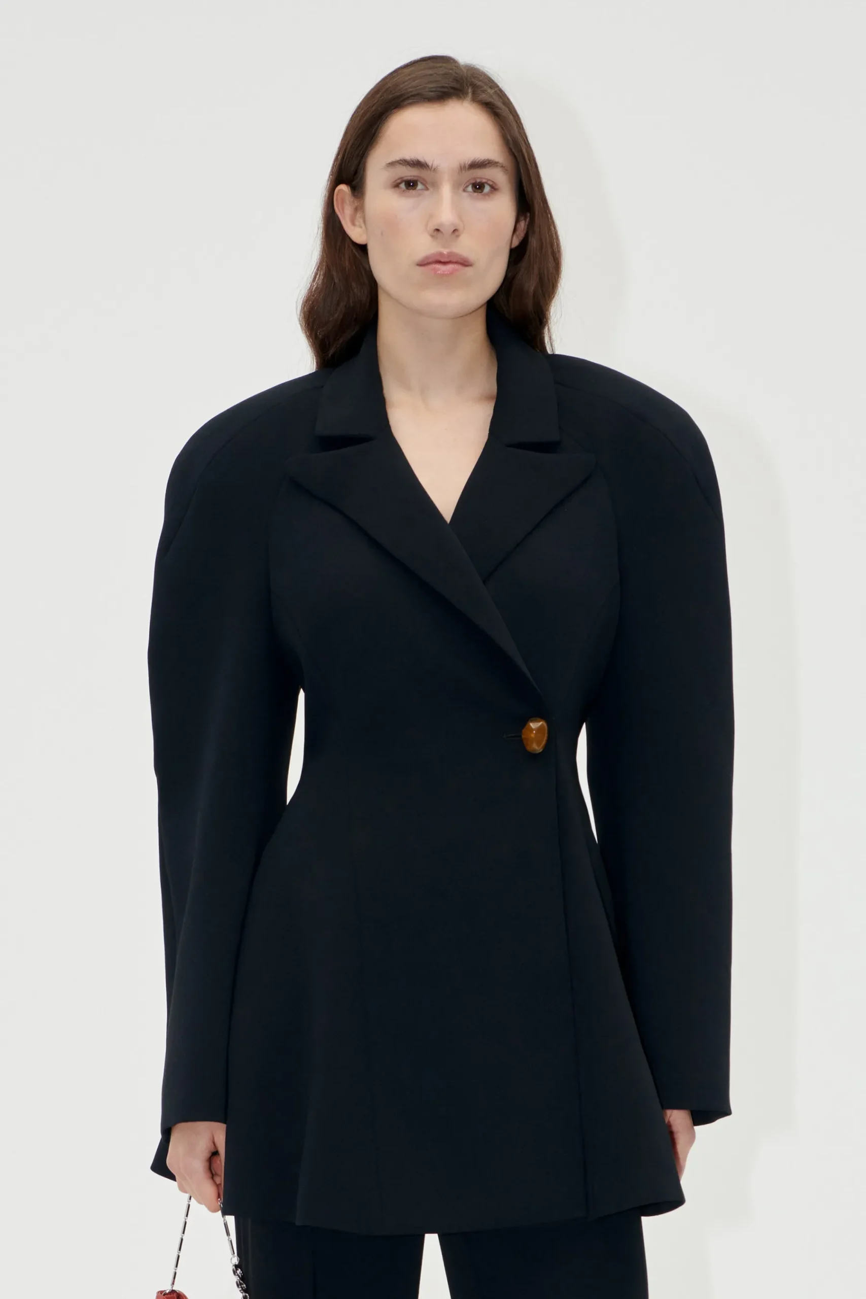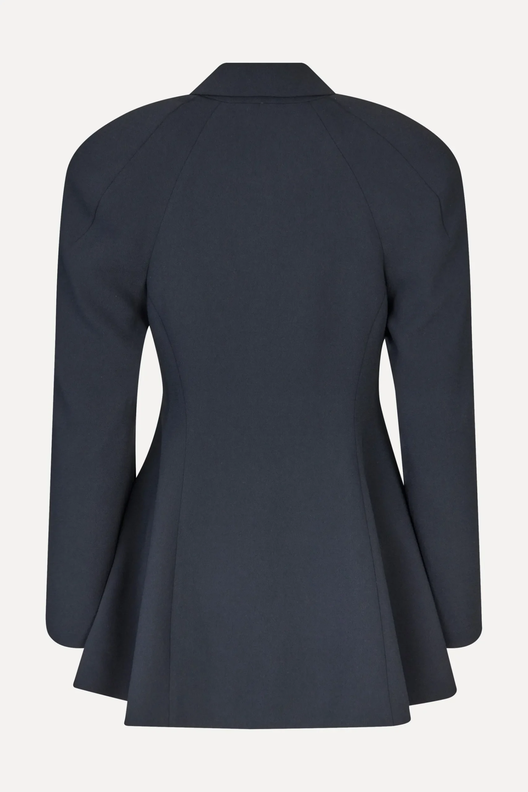 Enkeltradet sort blazer i vævet kvalitet med peplum, bred revers og markante skulderpuder. Detaljeret med en dekorativ, organisk knaplukning i taljen. Fuldt foret.