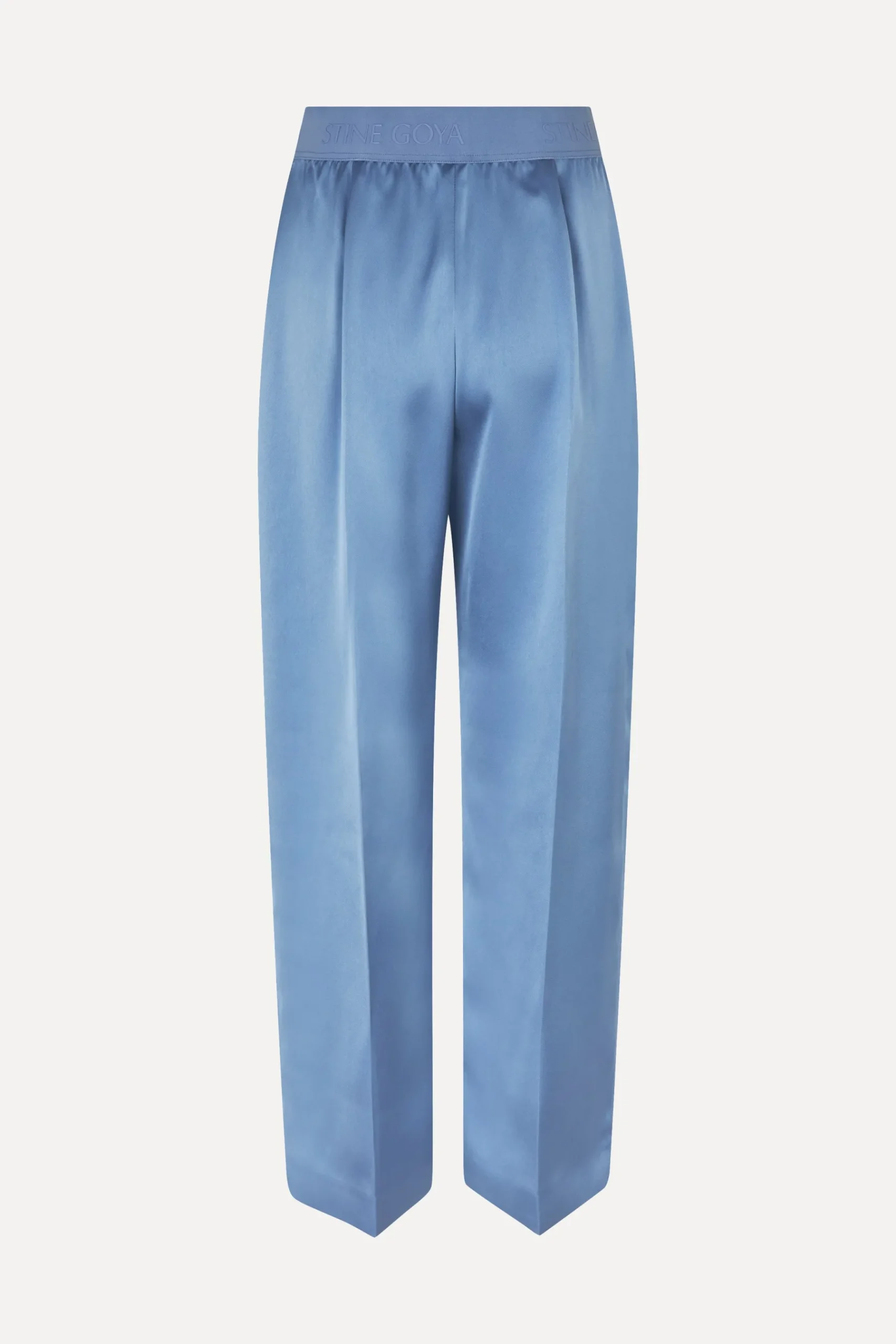 Blå bukser med elastisk talje dekoreret med STINE GOYA logo. Bukserne har læg foran, skjult lynlås i siden og praktiske sidelommer. Designet i en blød og glat kvalitet, som giver et elegant fald.